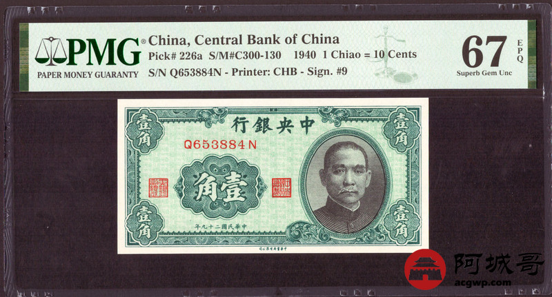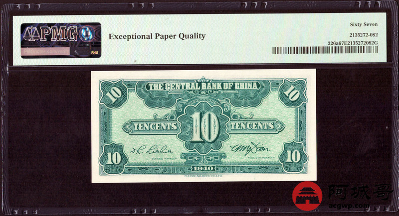 Lot:49 民国29年 中央银行 壹角 PMG 67EPQ