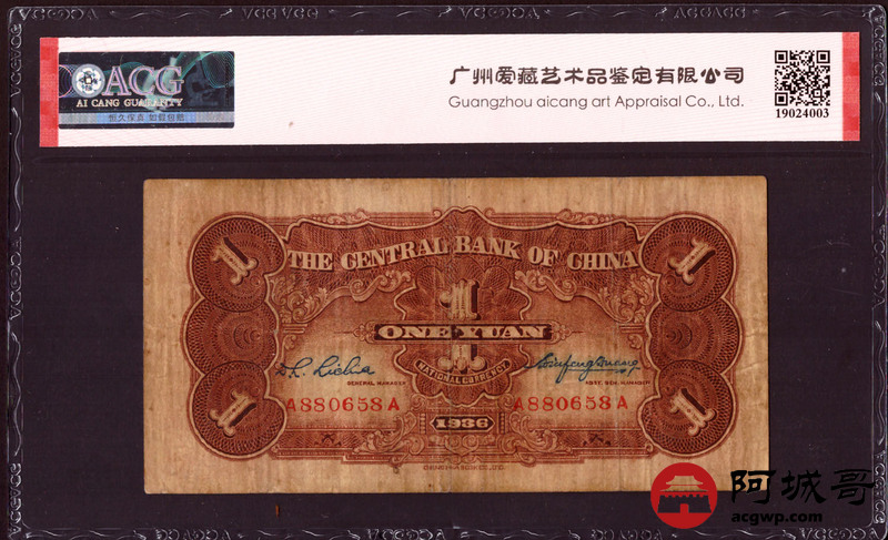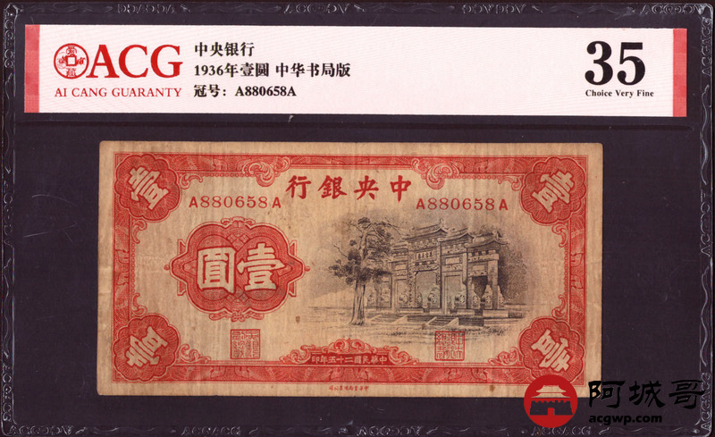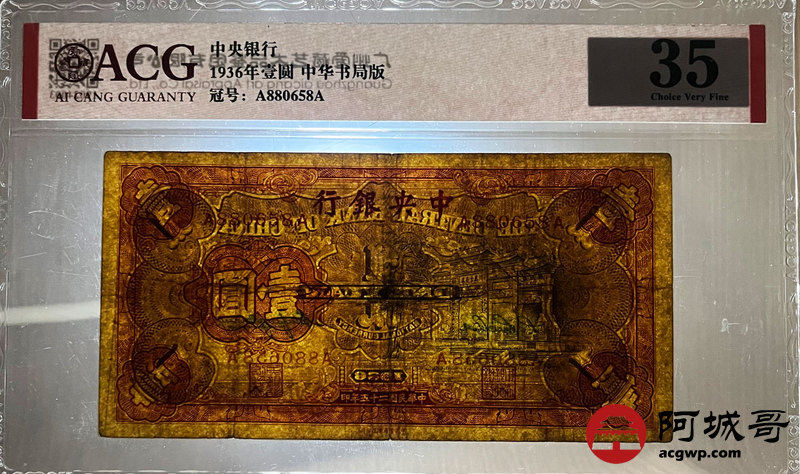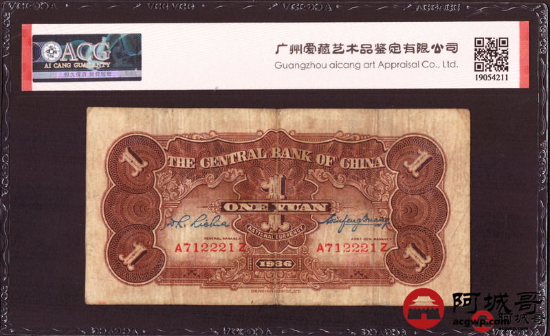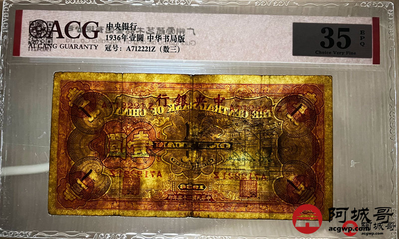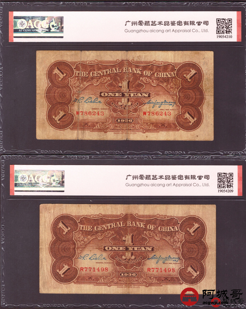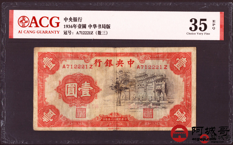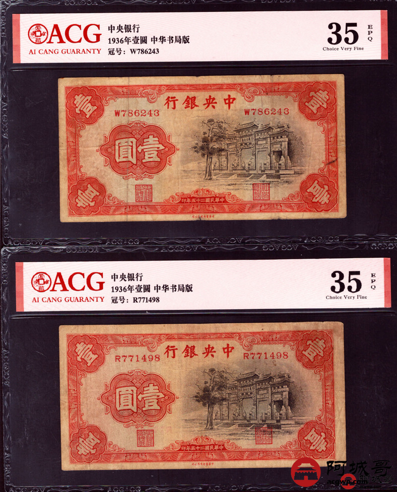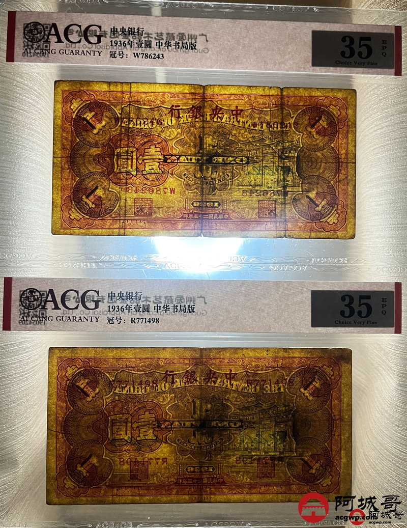 Lot:19 民国25年 中央银行 壹圆 中华书局版 ACG 35 好号无47;民国25年 中央银行 壹圆 中华书局版 其中一张数三 ACG 35EPQ