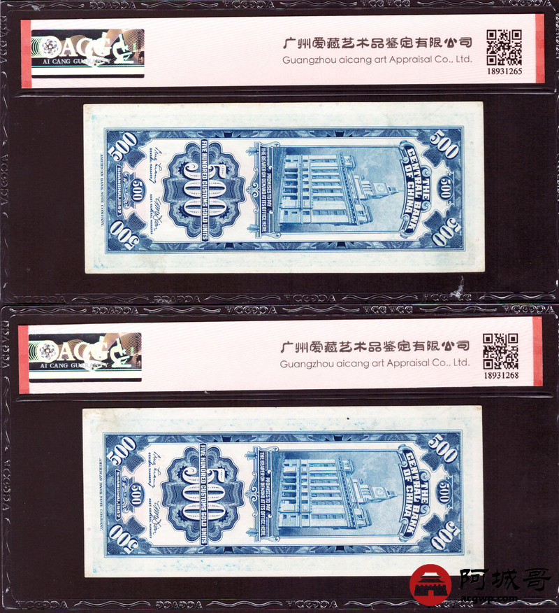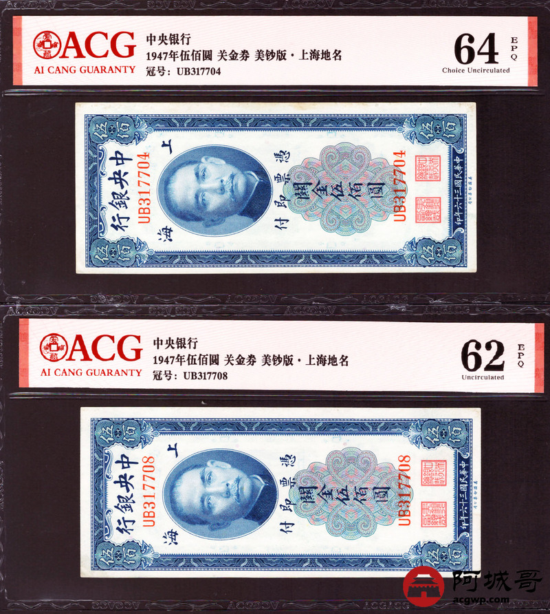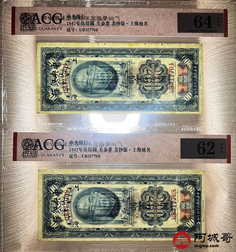 Lot:17 民国36年 中央银行 关金伍佰圆 美钞版 上海地名 ACG 62、ACG 64 EPQ 两张