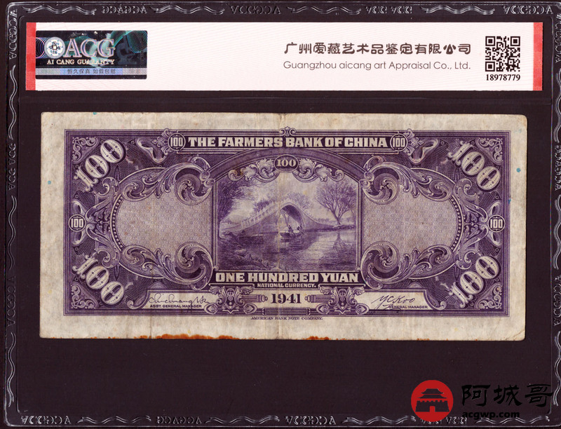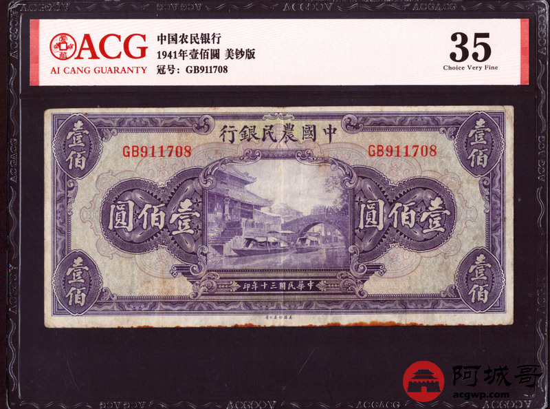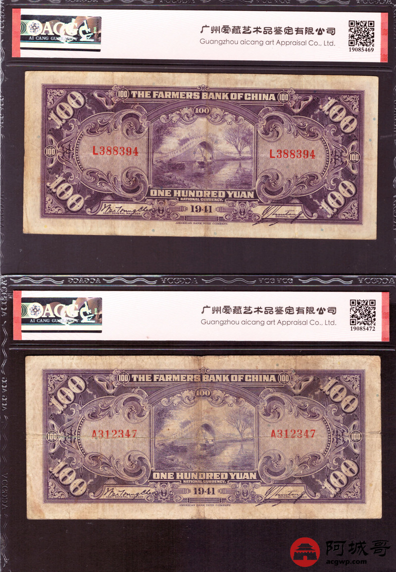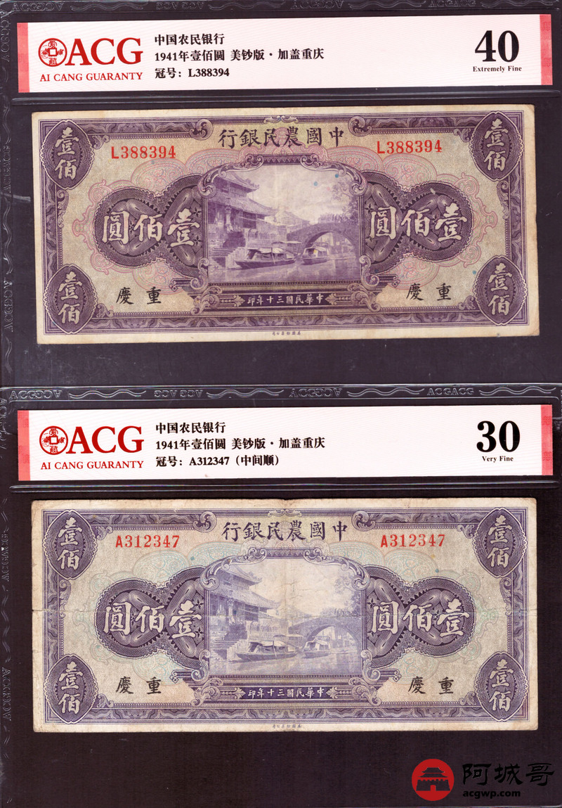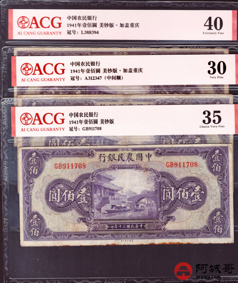 Lot:57 民国30年 中国农民银行 壹佰圆 美钞版 加盖重庆 中间顺 ACG 30、ACG 40 、ACG 35 三张