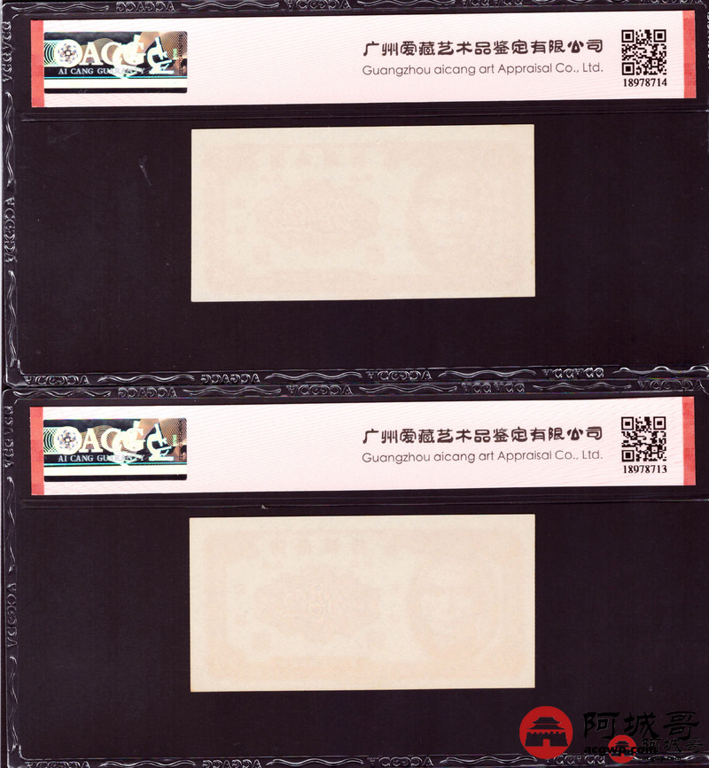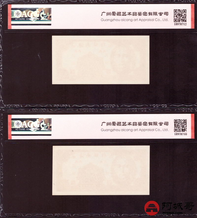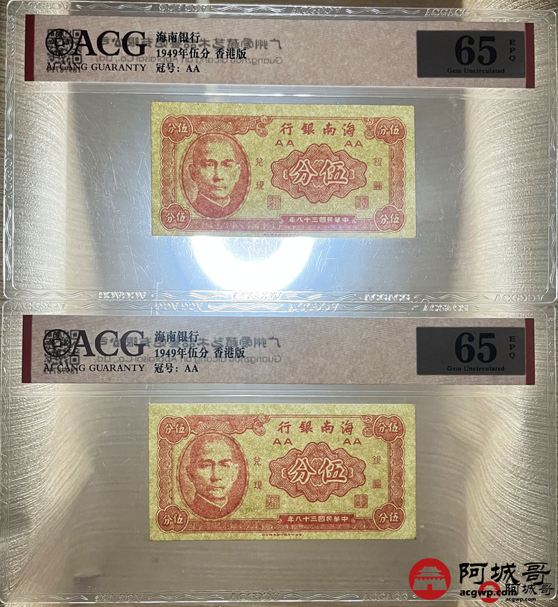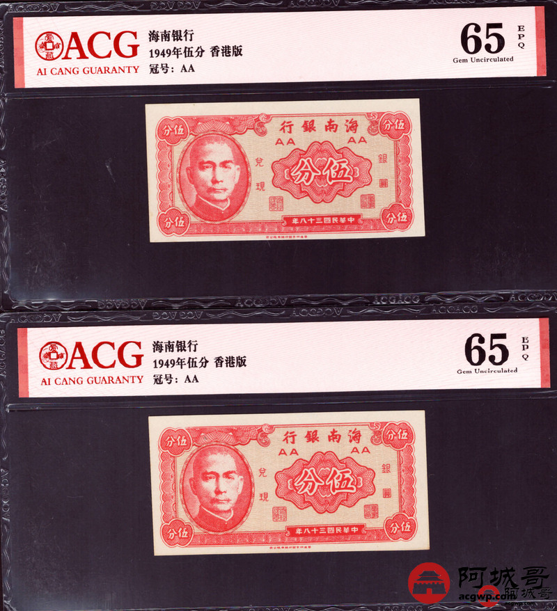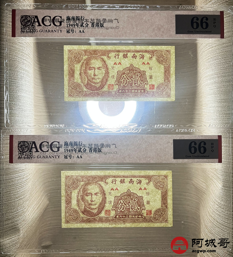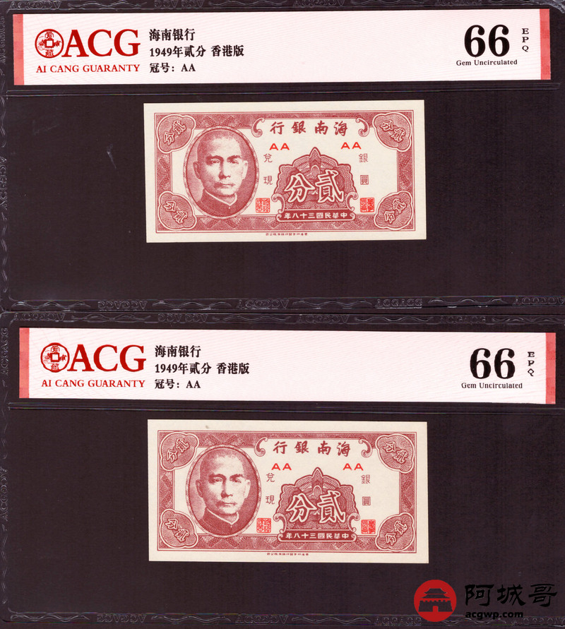 Lot:46 民国38年 海南银行 贰分 香港版ACG 66EPQ 两张;民国38年 海南银行 伍分 香港版 ACG 65EPQ 两张连号