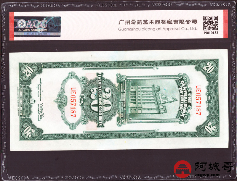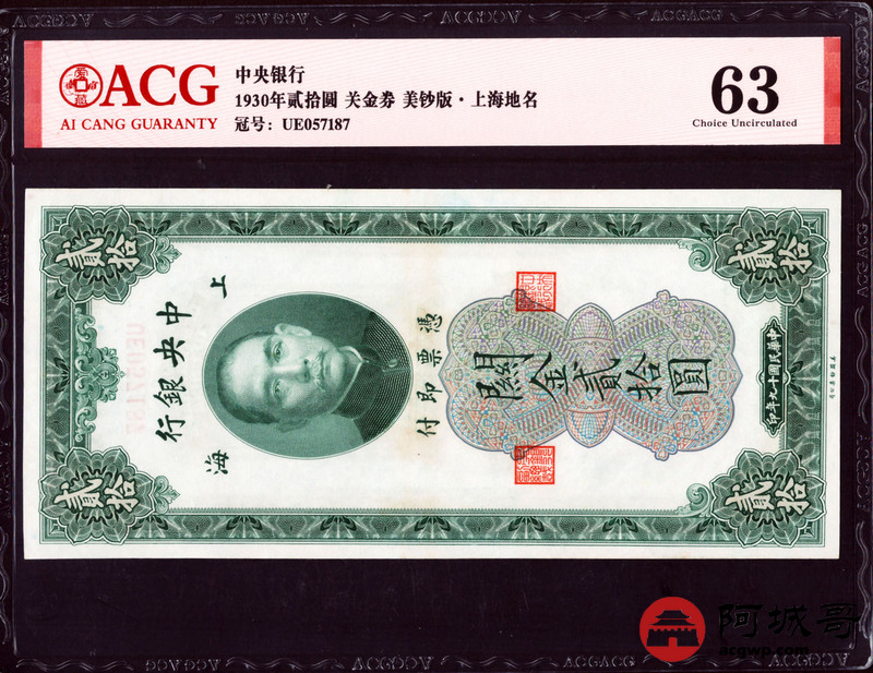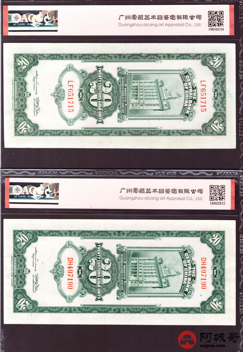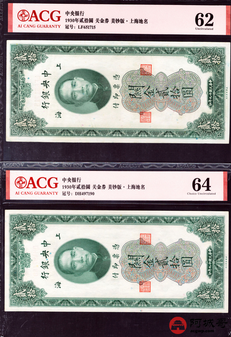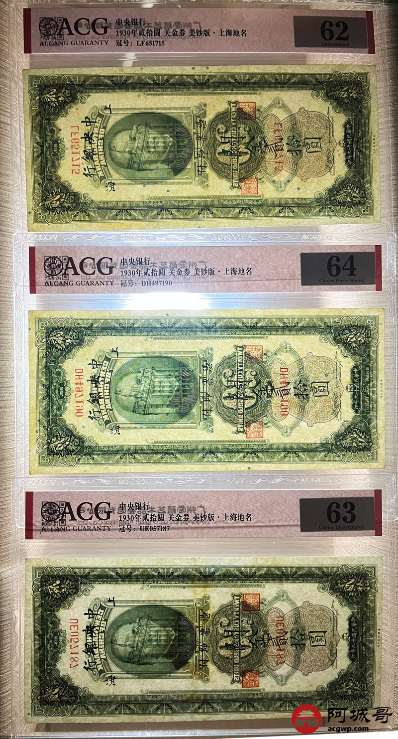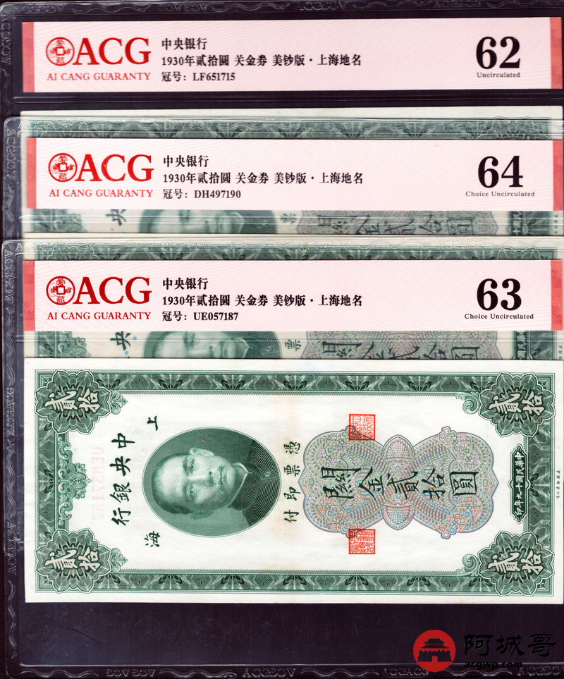 Lot:3 民国19年 中央银行 关金券贰拾圆 美钞版 上海地名 ACG 62、ACG 63、ACG 64 三张