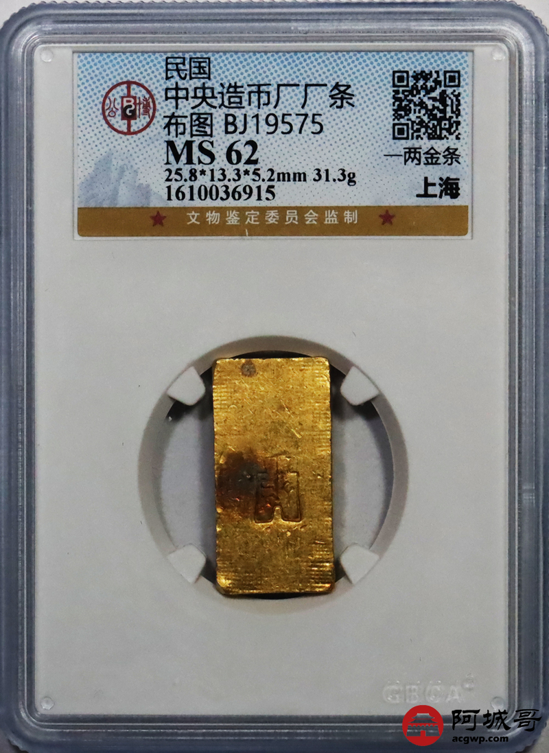 Lot:10 中央造币厂厂条 一两金条 31.3克 公博MS62