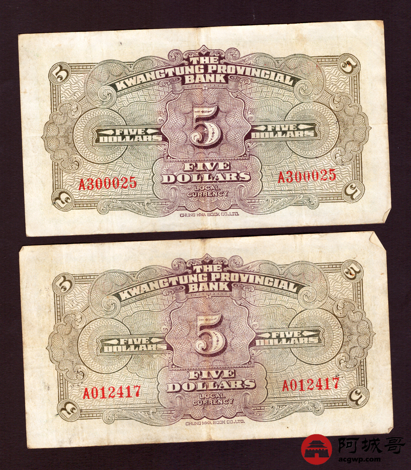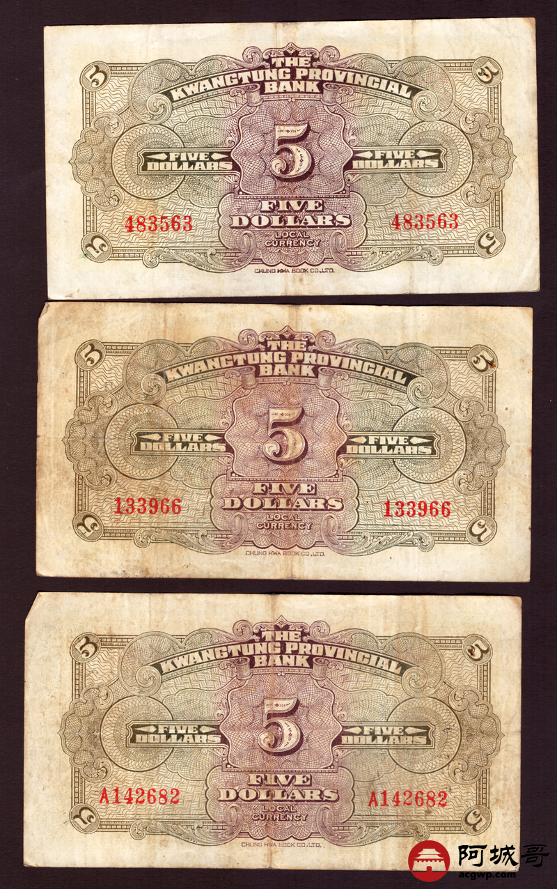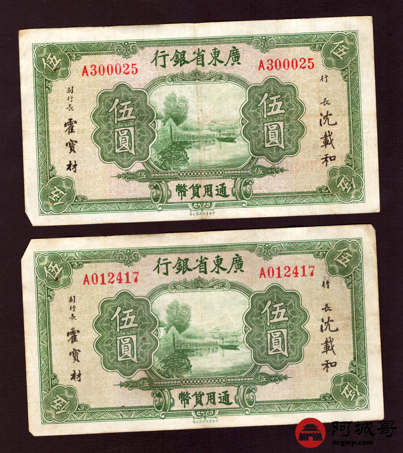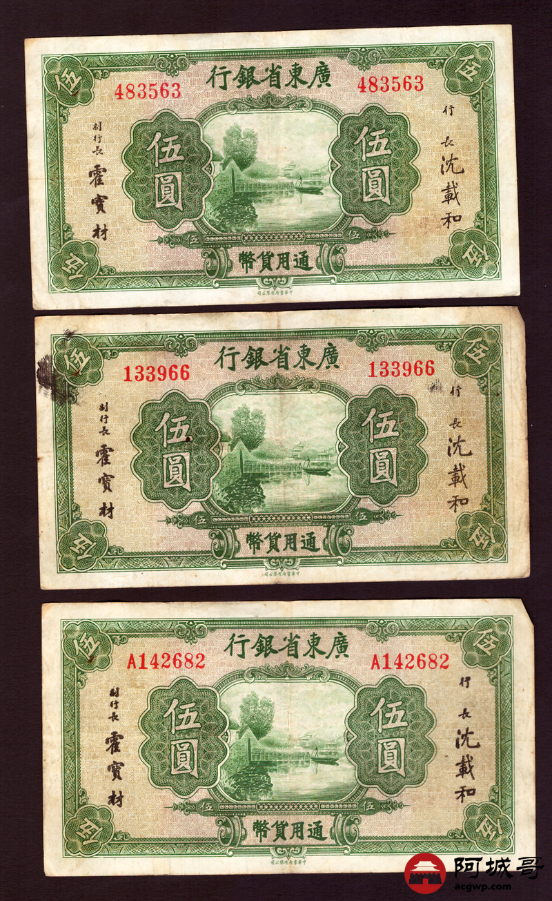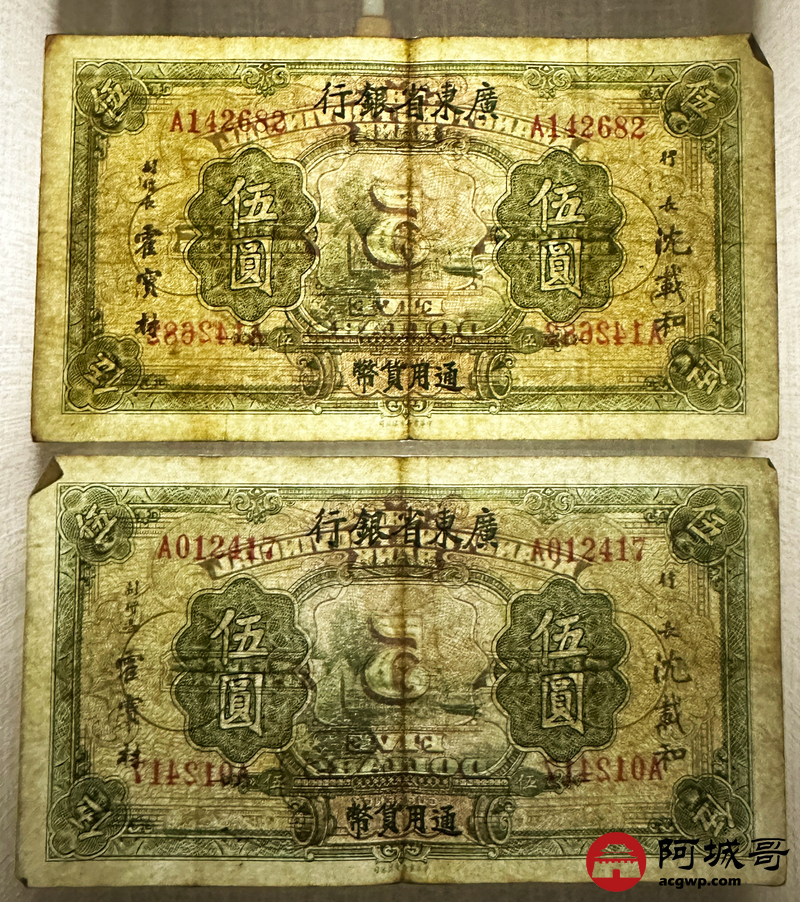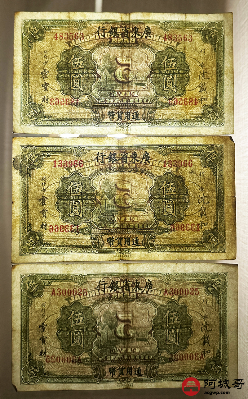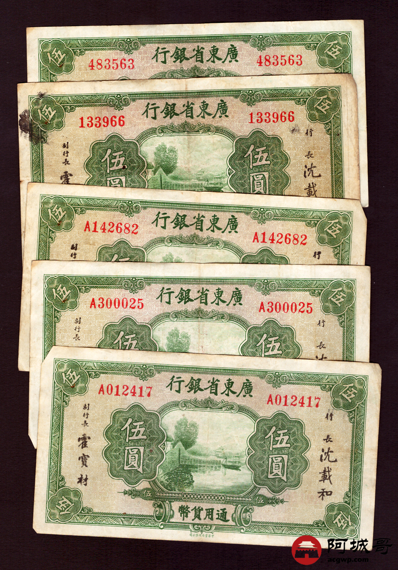 Lot:45 广东省银行 伍圆 5张一组 69至7成新