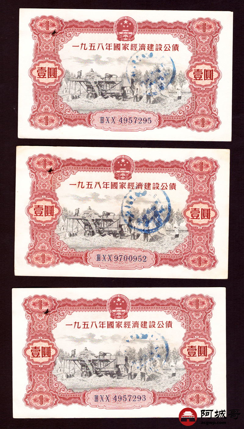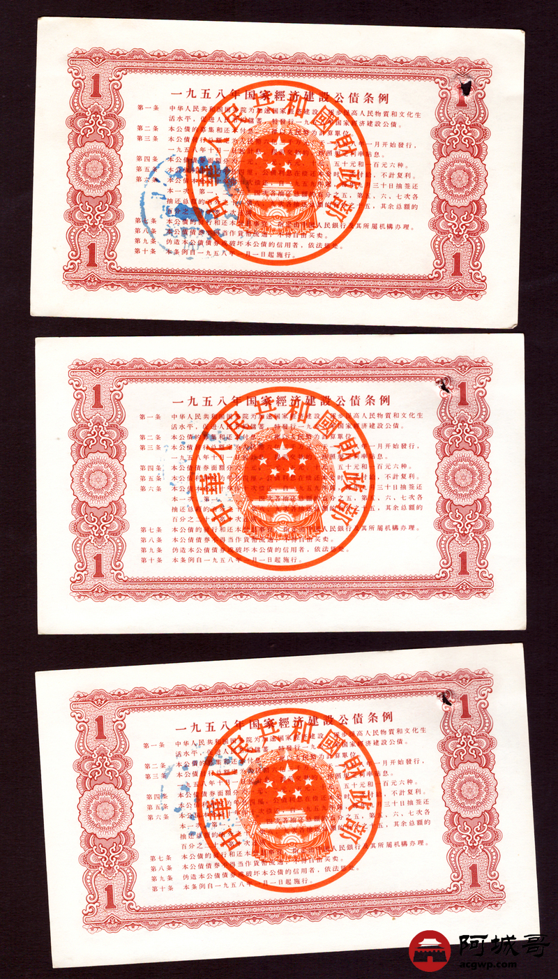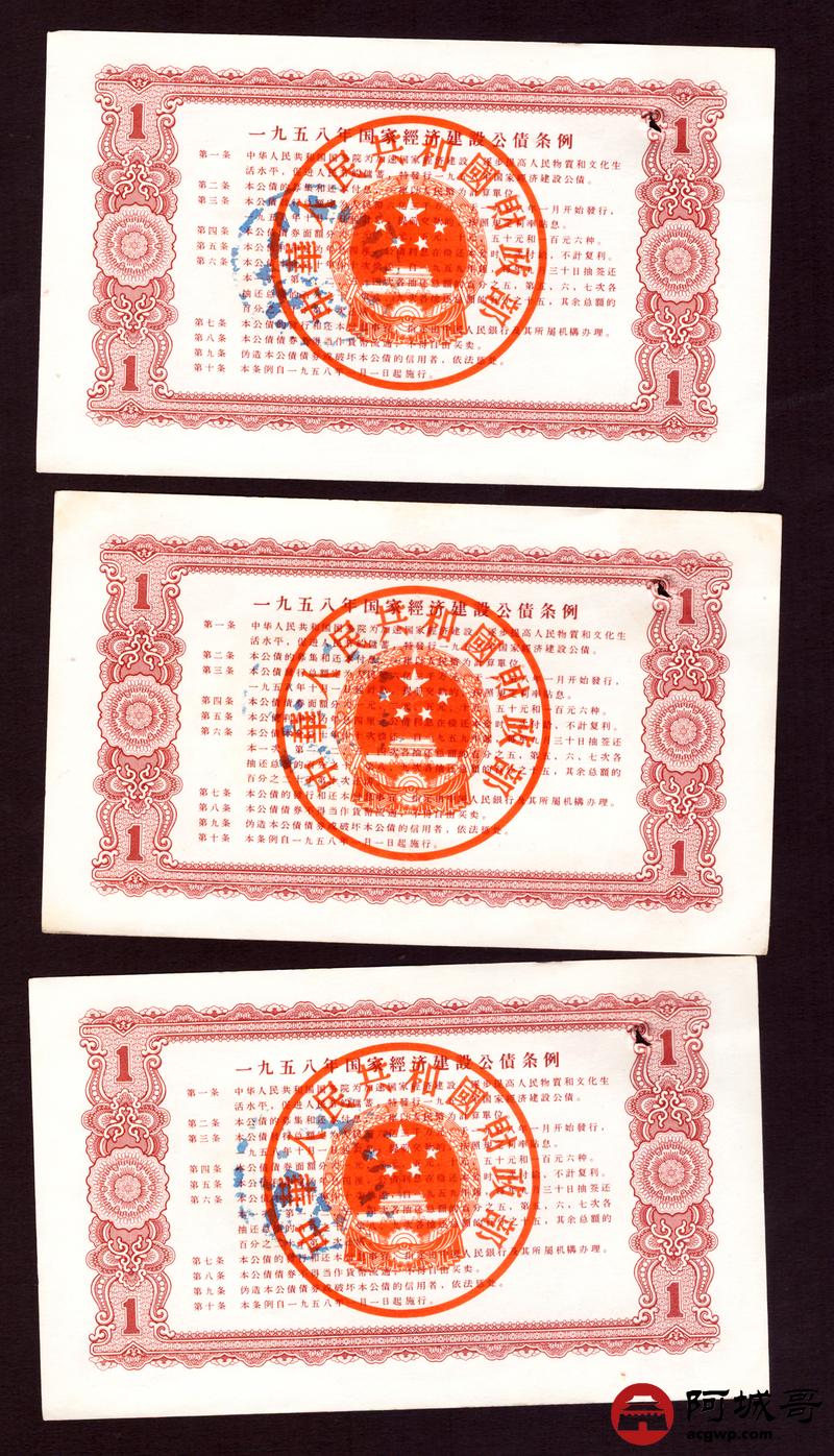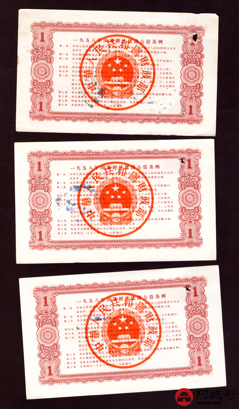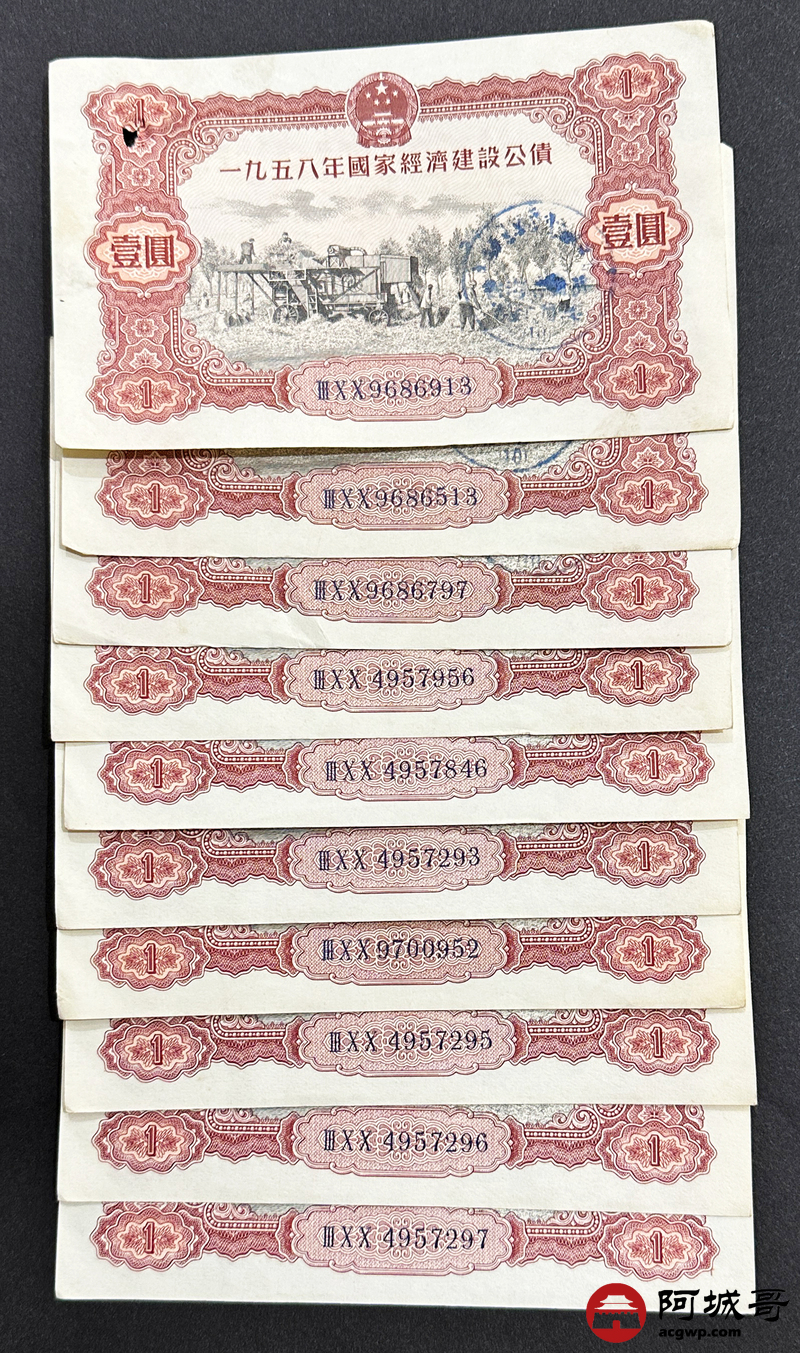 Lot:33 一九五八年国家经济建设公债 壹圆 有装订孔10张一组 9成新