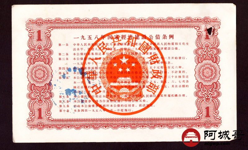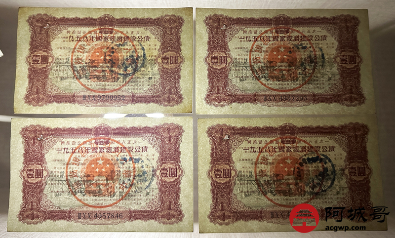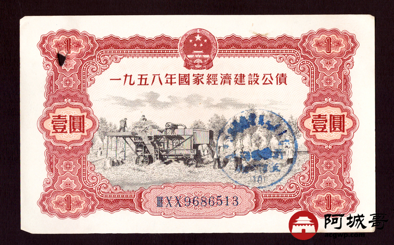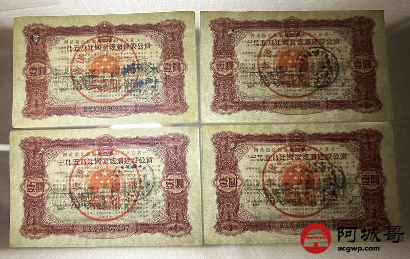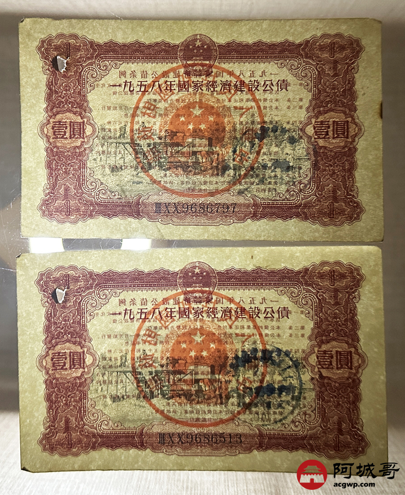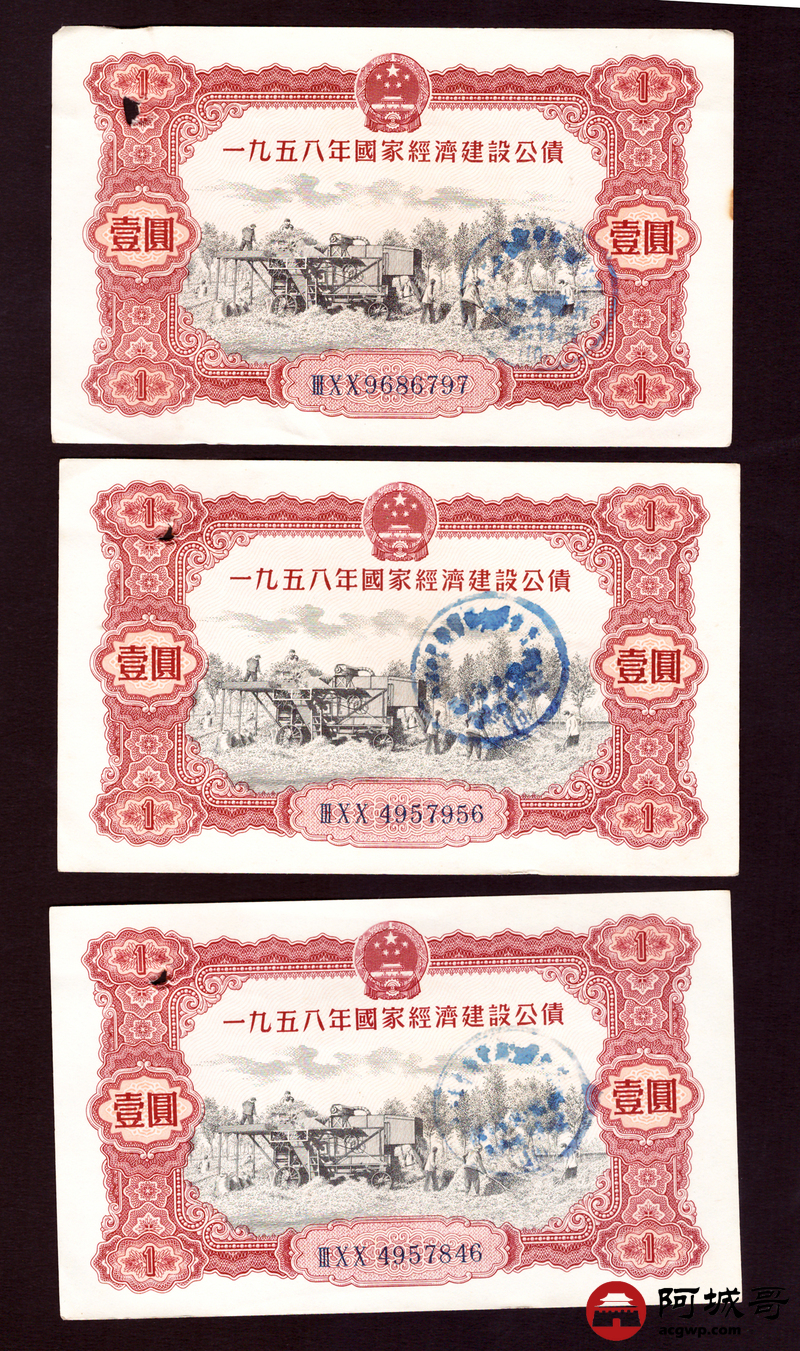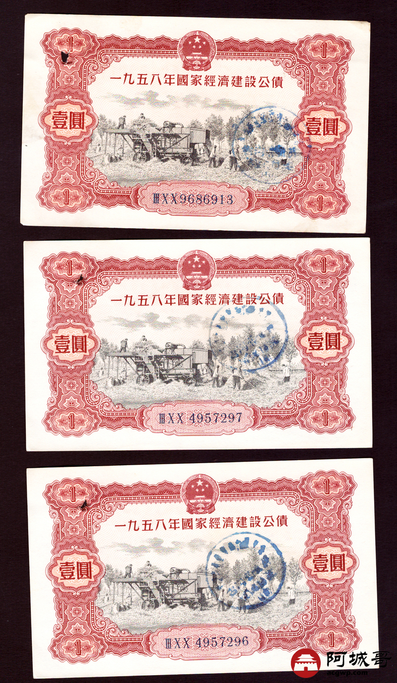 Lot:33 一九五八年国家经济建设公债 壹圆 有装订孔10张一组 9成新