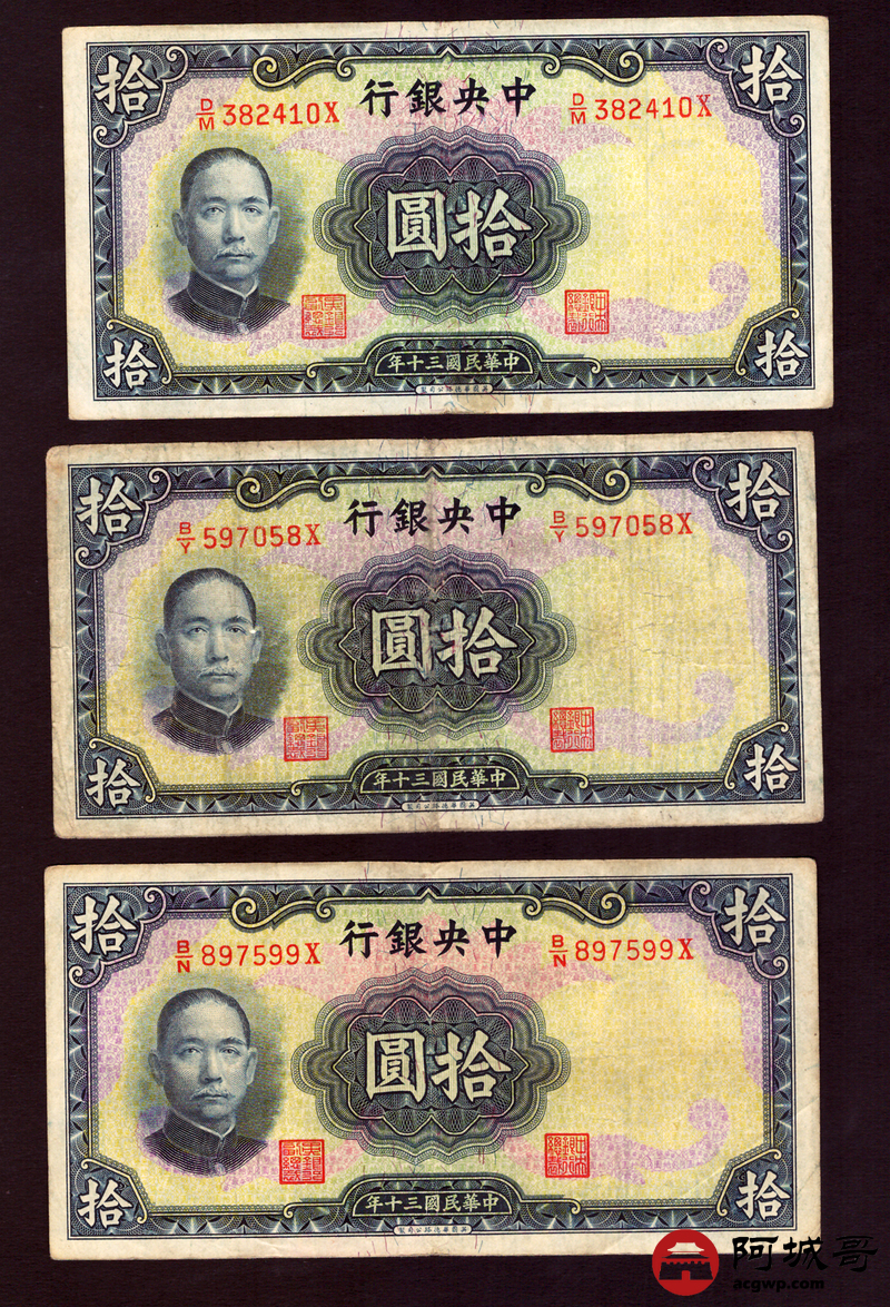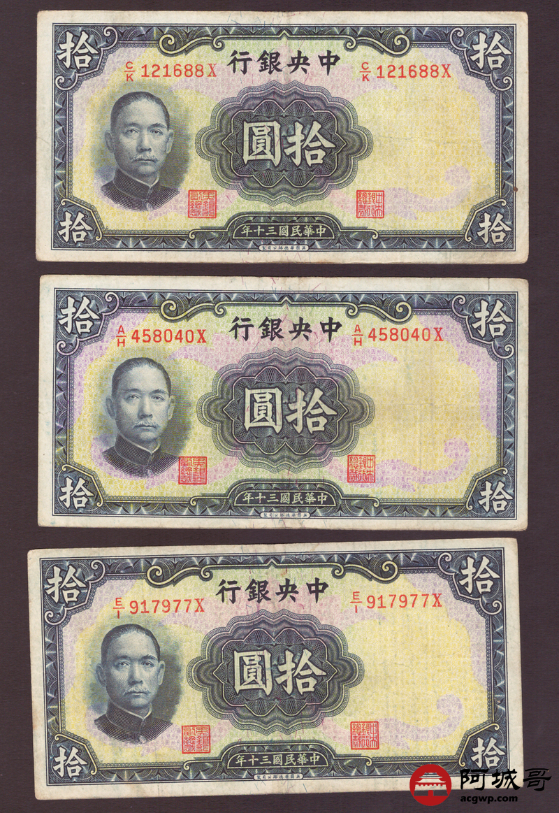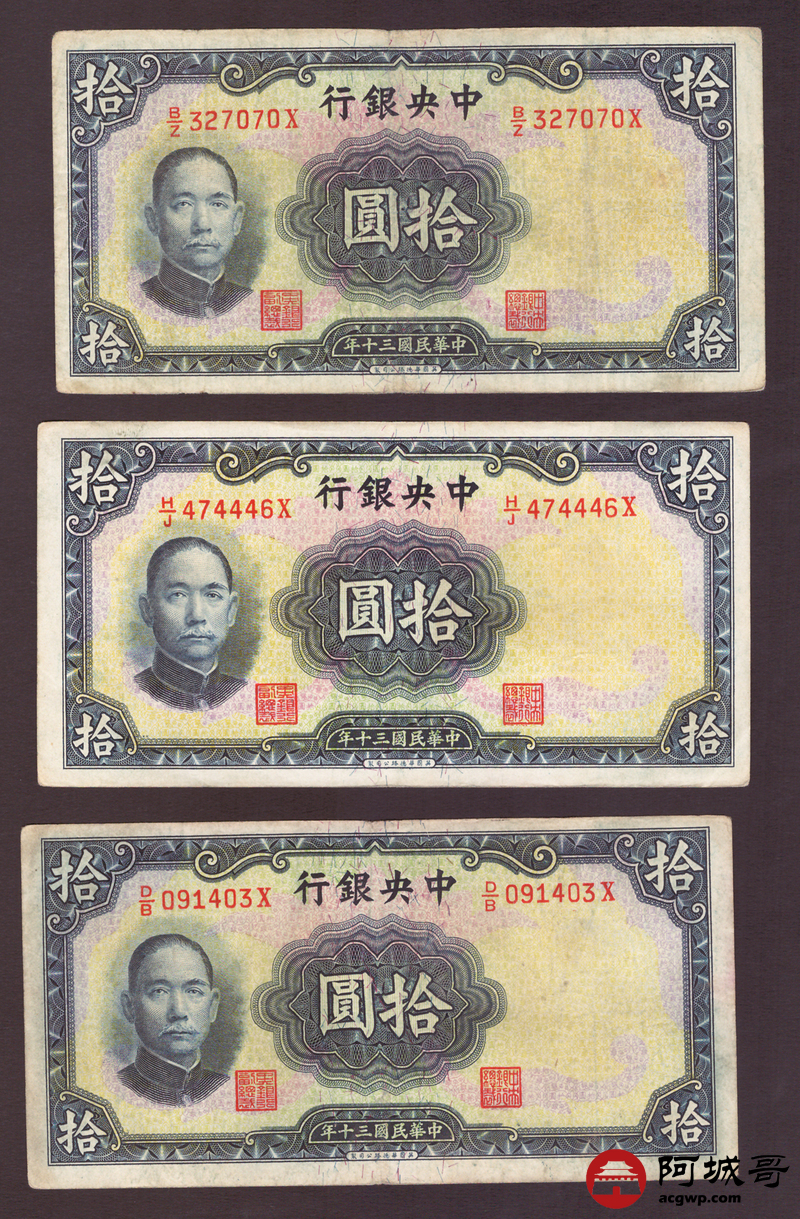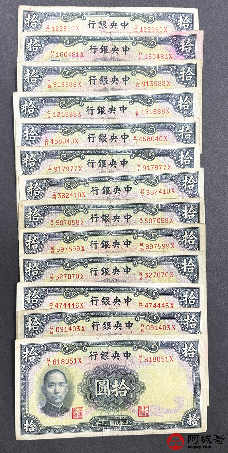 Lot:2 民国三十年 中央银行 拾圆 13张一组 72成新