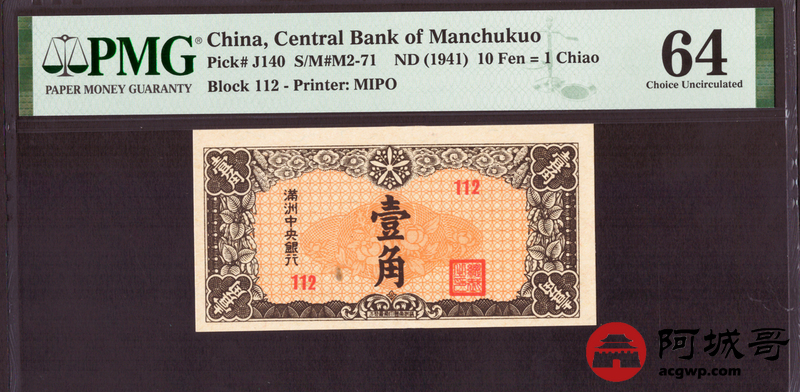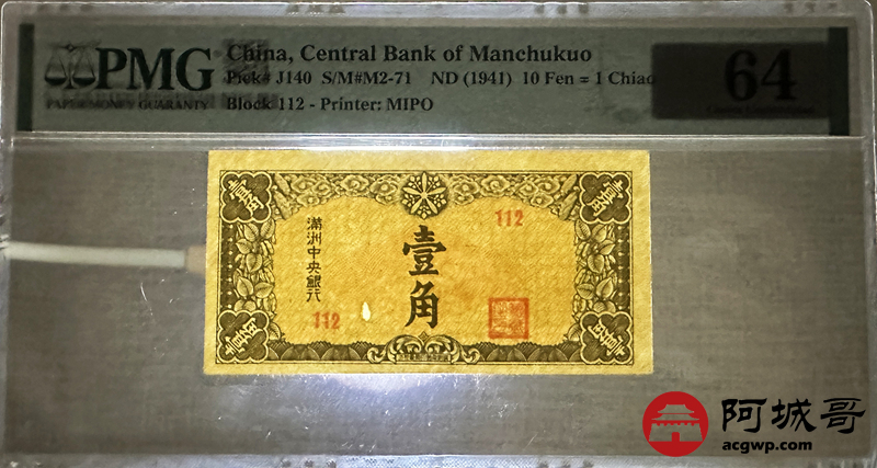 Lot:35 满洲中央银行 壹角 (1941年) PMG 64