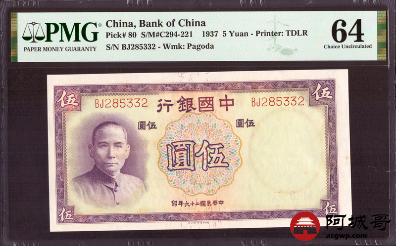 Lot:32 民国26年 中国银行 伍圆 PMG 64 好号无47