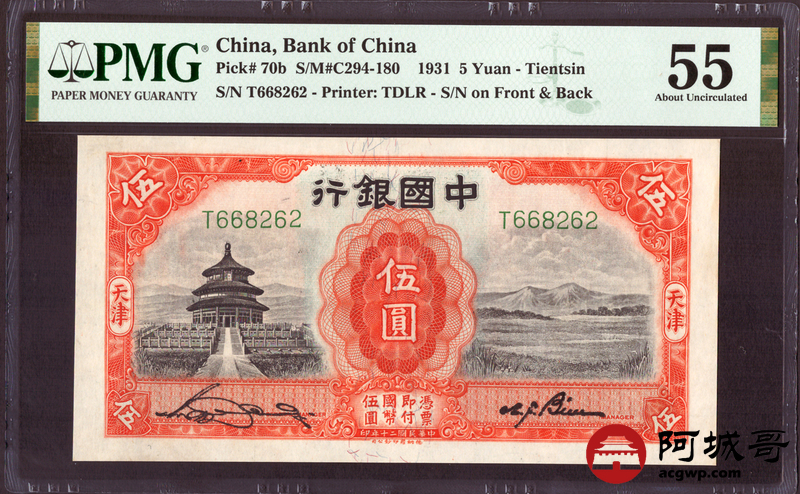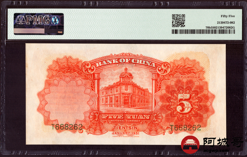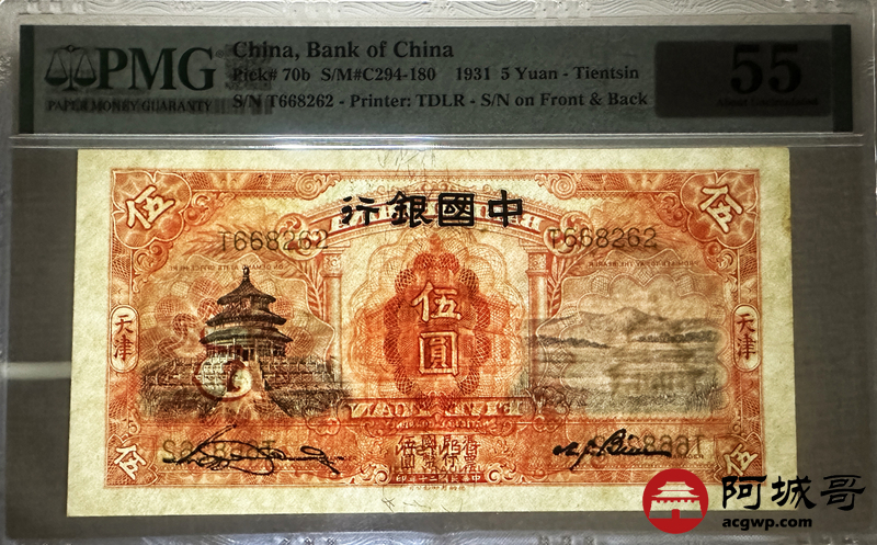 Lot:31 民国20年 中国银行 伍圆 天津地名PMG 55 好号无347、数三号