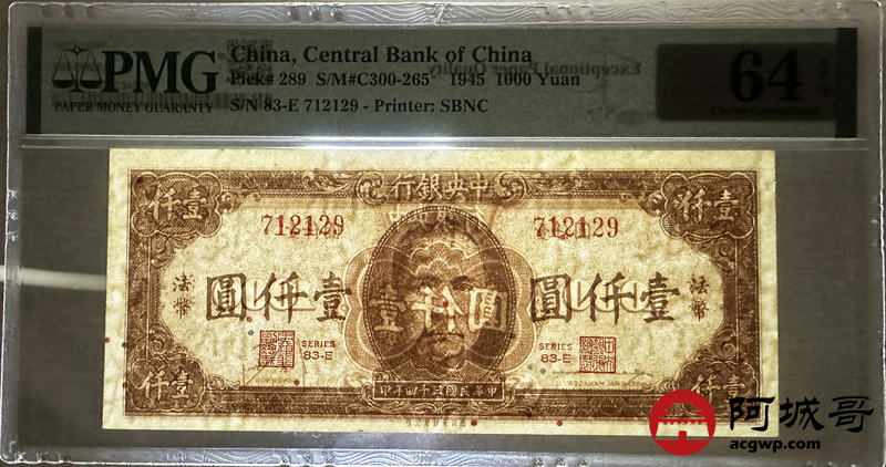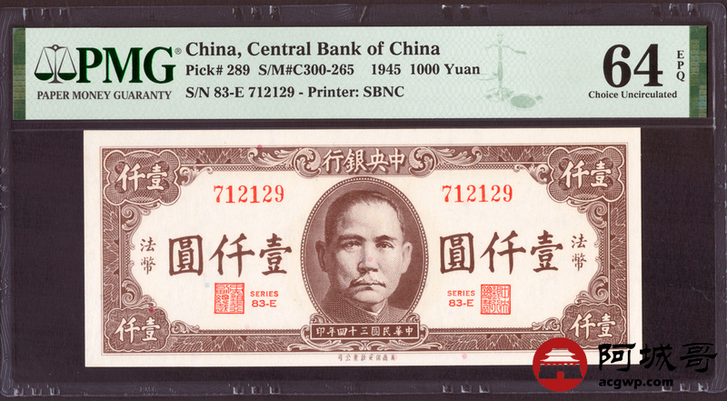 Lot:46 民国34年 中央银行 壹仟圆 PMG 64EPQ 好号无4