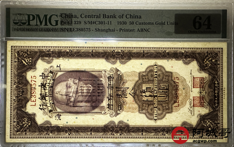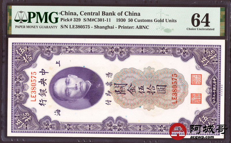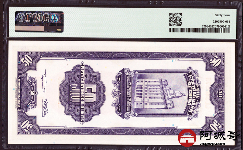 Lot:53 民国19年 中央银行 关金伍拾圆 上海地名 PMG 64 好号无4