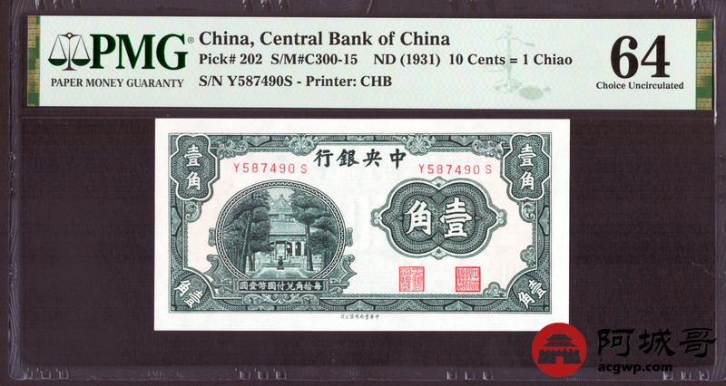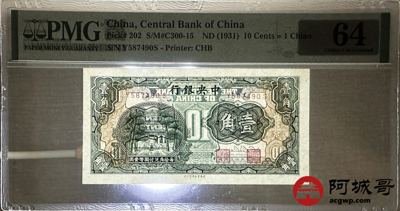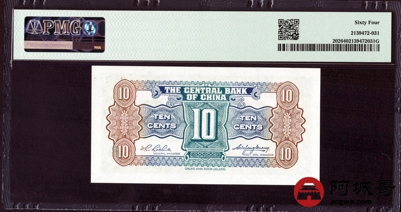 Lot:44 中央银行 壹角 (1931年 ) PMG 64