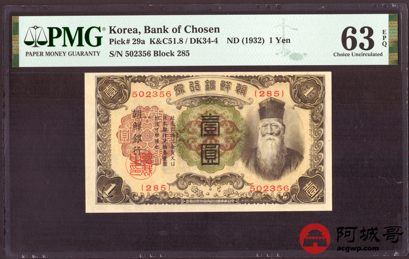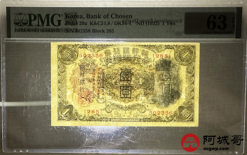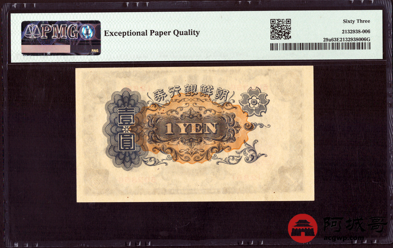 Lot:10 朝鲜银行 壹圆 (1932年) PMG 63EPQ 好号无47