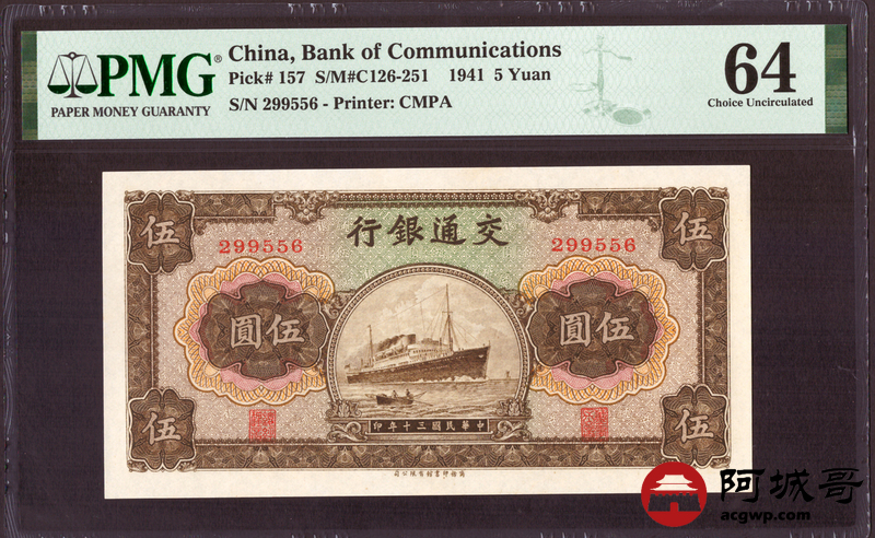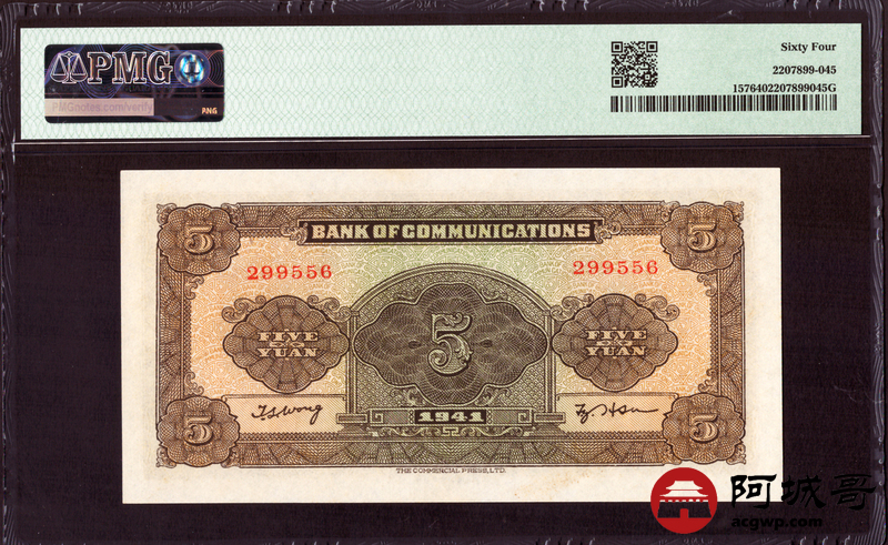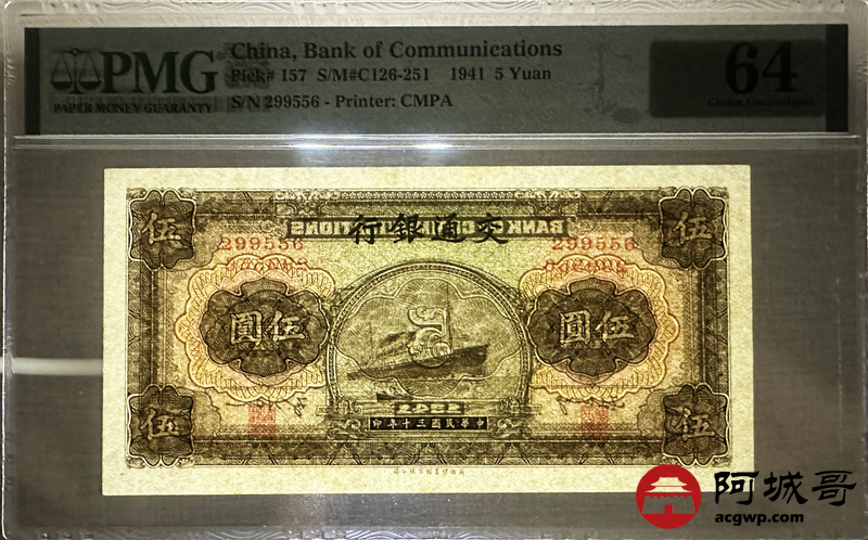 Lot:1 民国30年 交通银行 伍圆 PMG 64 好号无347