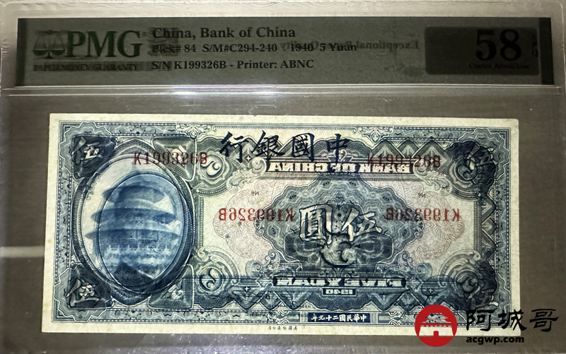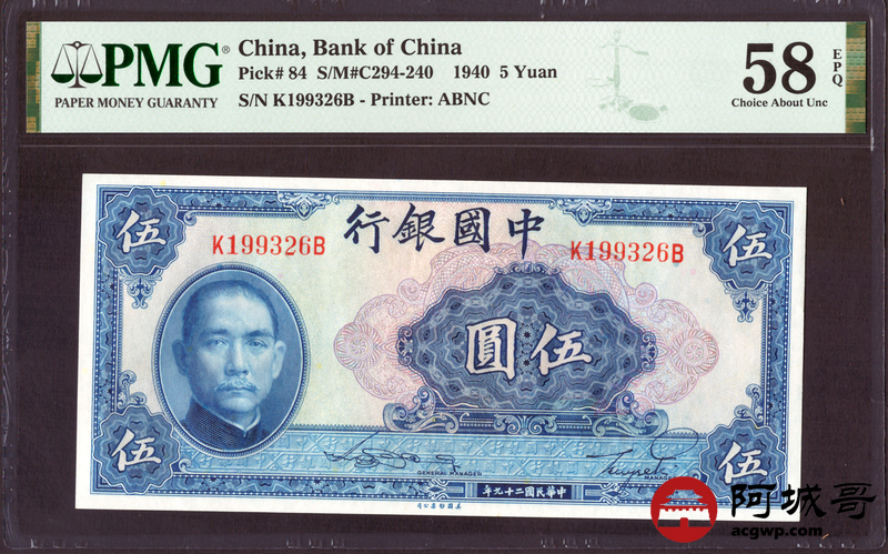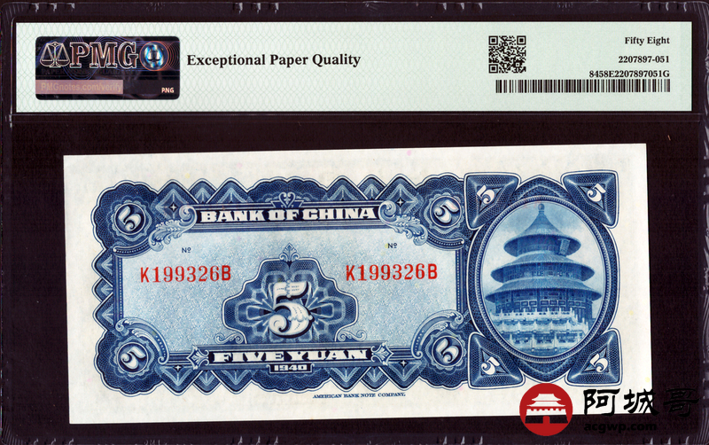Lot:18 民国29年 中国银行 伍圆 PMG 58EPQ 好号无47、生日号