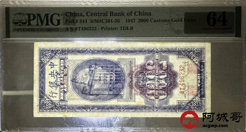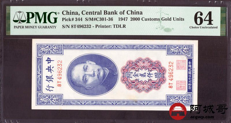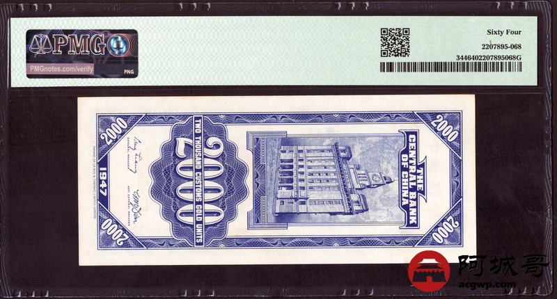 Lot:36 民国36年 中央银行 关金贰仟圆 PMG 64