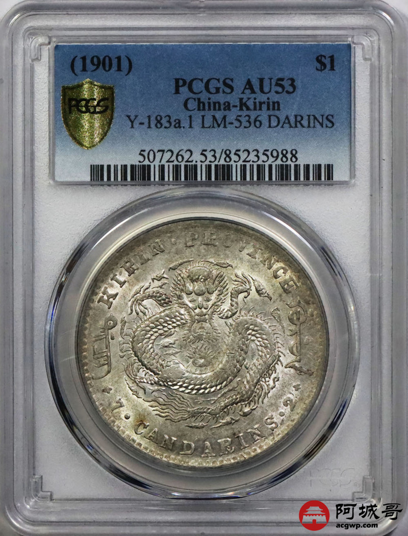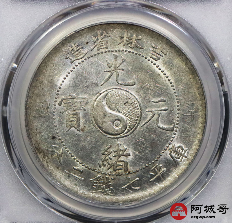Lot:1406 1901辛丑年吉林省造光绪元宝库平七钱二分银币一枚,黄油底板 PCGS AU53评级编号:85235988
