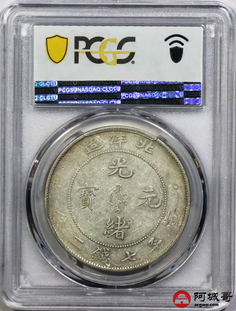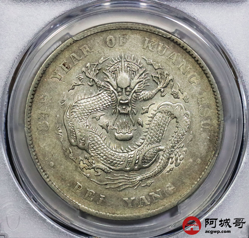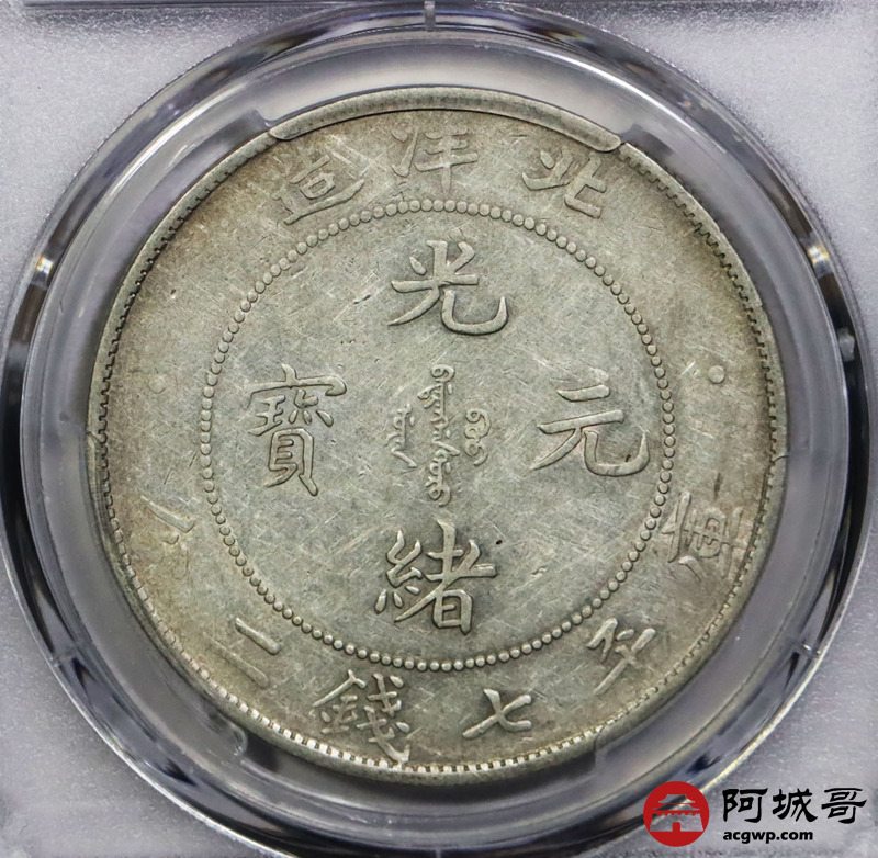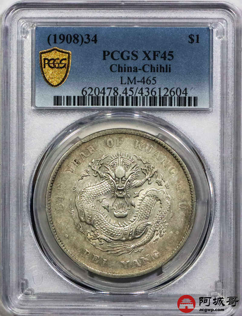 Lot:1636 1908光绪三十四年北洋造光绪元宝库平七钱二分银币一枚,黄油淡彩底板 PCGS XF45评级编号:43612604