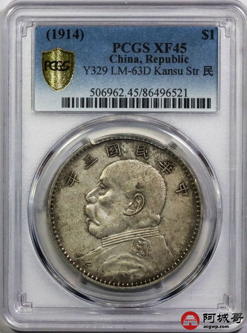 Lot:1856 1914民国三年袁世凯像壹圆银币一枚,甘肃版,原味 PCGS XF45评级编号:86496521