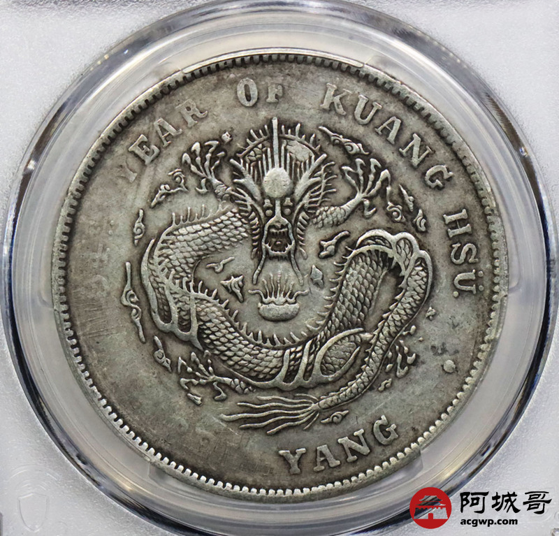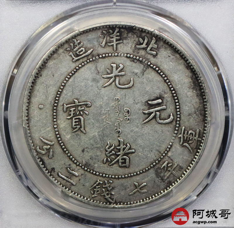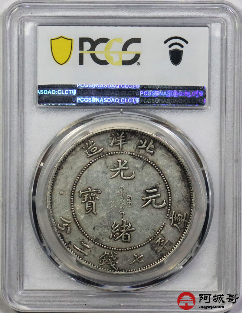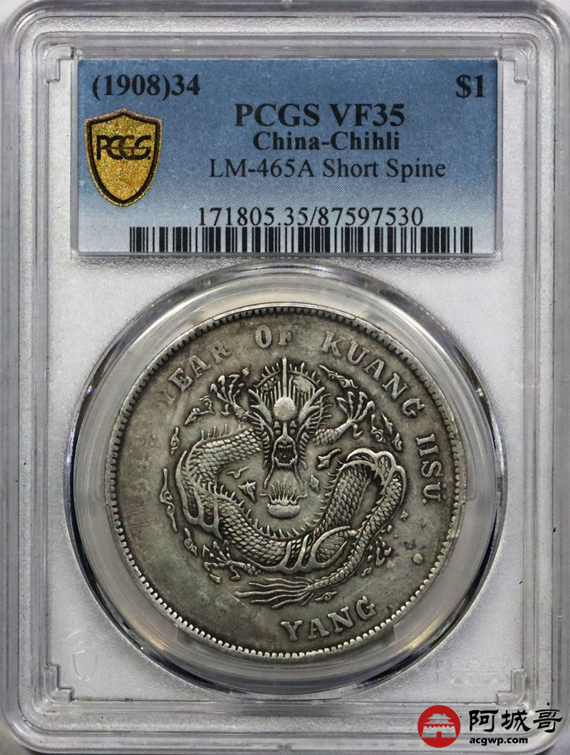 Lot:1627 1908光绪三十四年北洋造光绪元宝库平七钱二分银币一枚,短尾版,原味 PCGS VF35评级编号:87597530