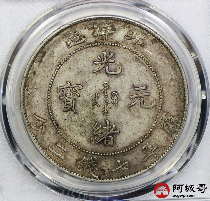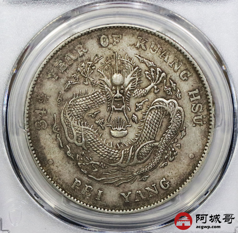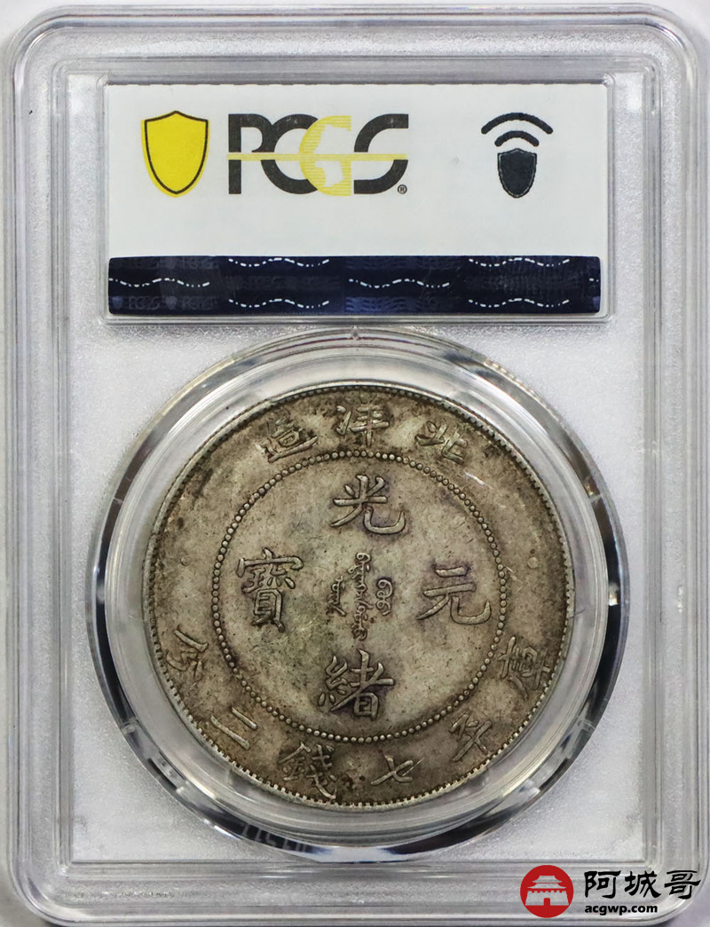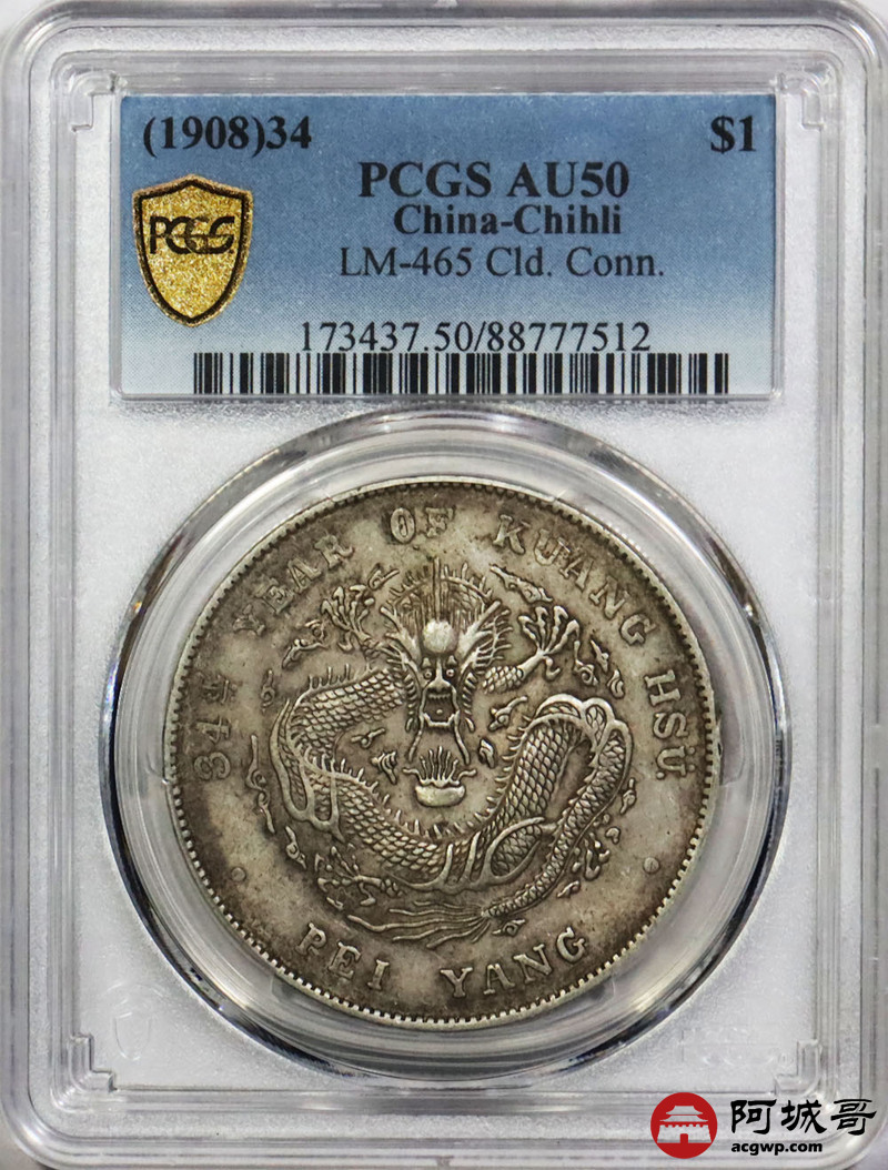 Lot:1759 1908光绪三十四年北洋造光绪元宝库平七钱二分银币一枚,原汁原味,龙鳞饱满 PCGS AU50评级编号:88777512