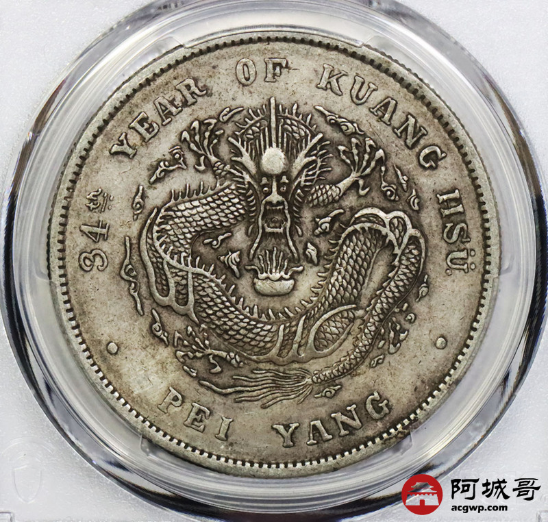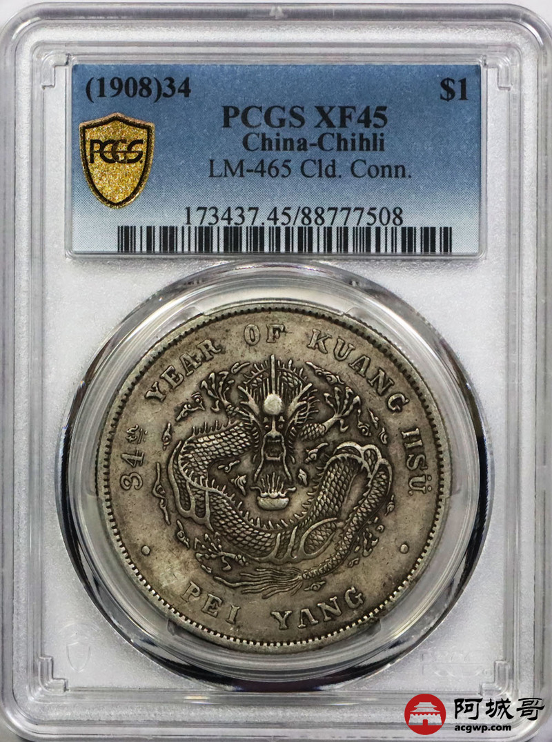 Lot:1606 1908光绪三十四年北洋造光绪元宝库平七钱二分银币一枚,原味 PCGS XF45评级编号:88777508