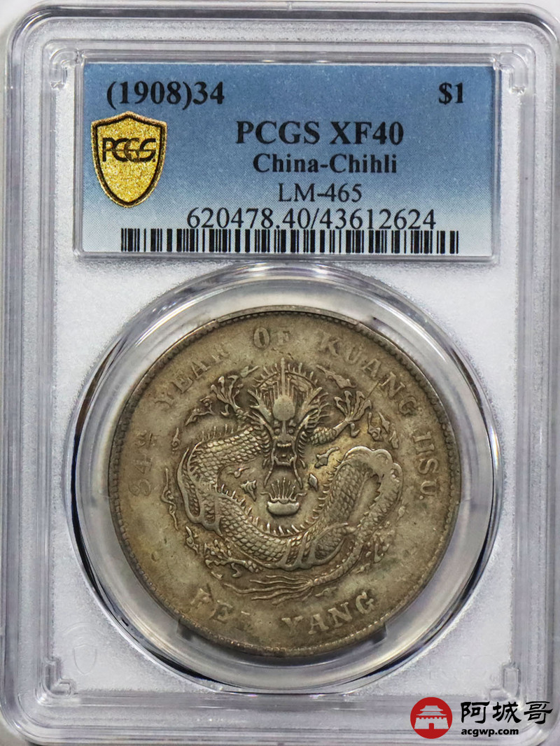 Lot:1620 1908光绪三十四年北洋造光绪元宝库平七钱二分银币一枚,原味PCGS XF40评级编号:43612624