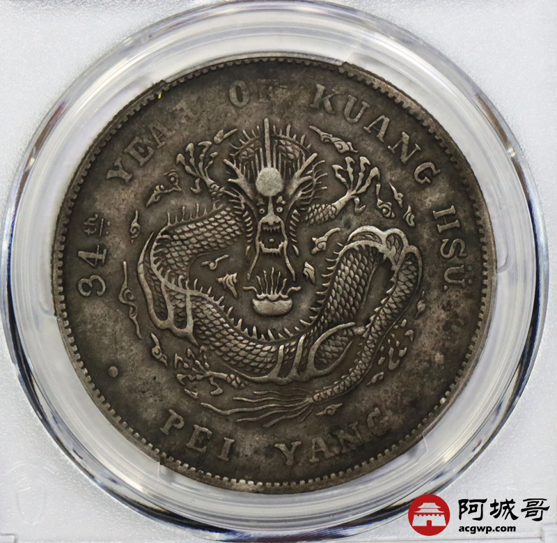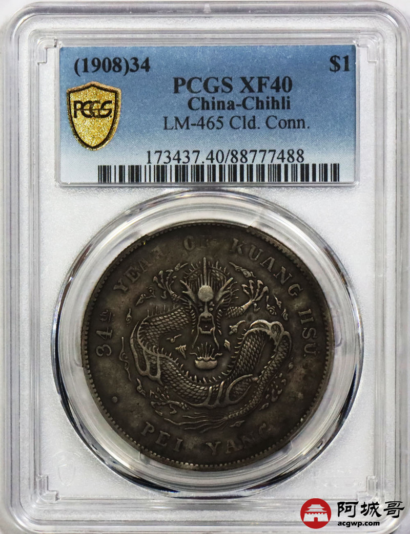 Lot:1604 1908光绪三十四年北洋造光绪元宝库平七钱二分银币一枚,老包浆 PCGS XF40评级编号:88777488