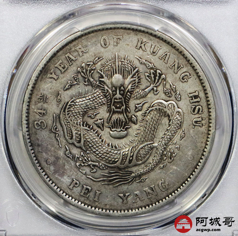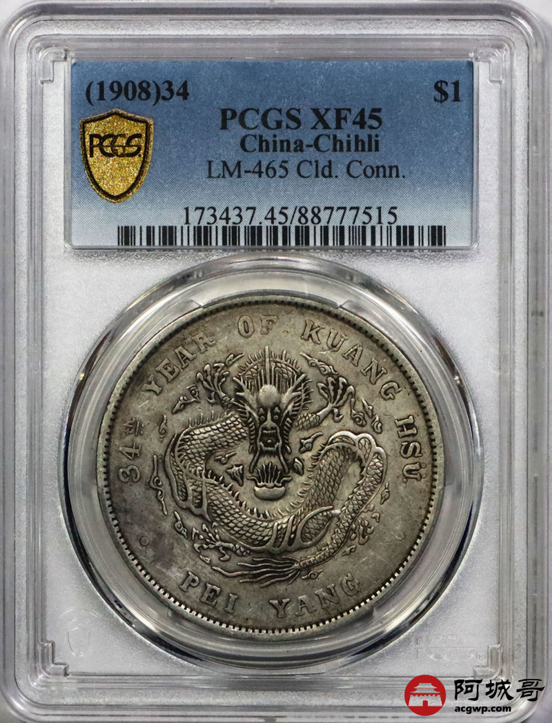 Lot:1581 1908光绪三十四年北洋造光绪元宝库平七钱二分银币一枚,原味PCGS XF45评级编号:88777515
