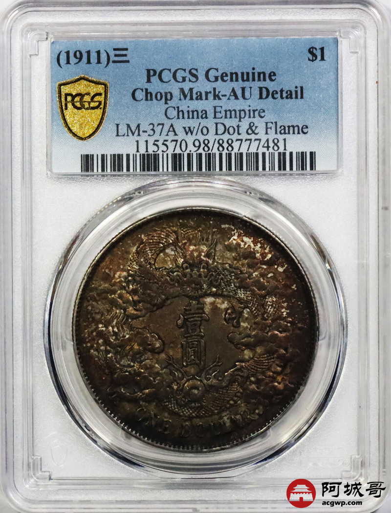 Lot:1826 1911宣统三年大清银币壹圆银币一枚,原味老五彩 PCGS AU98评级编号:88777481