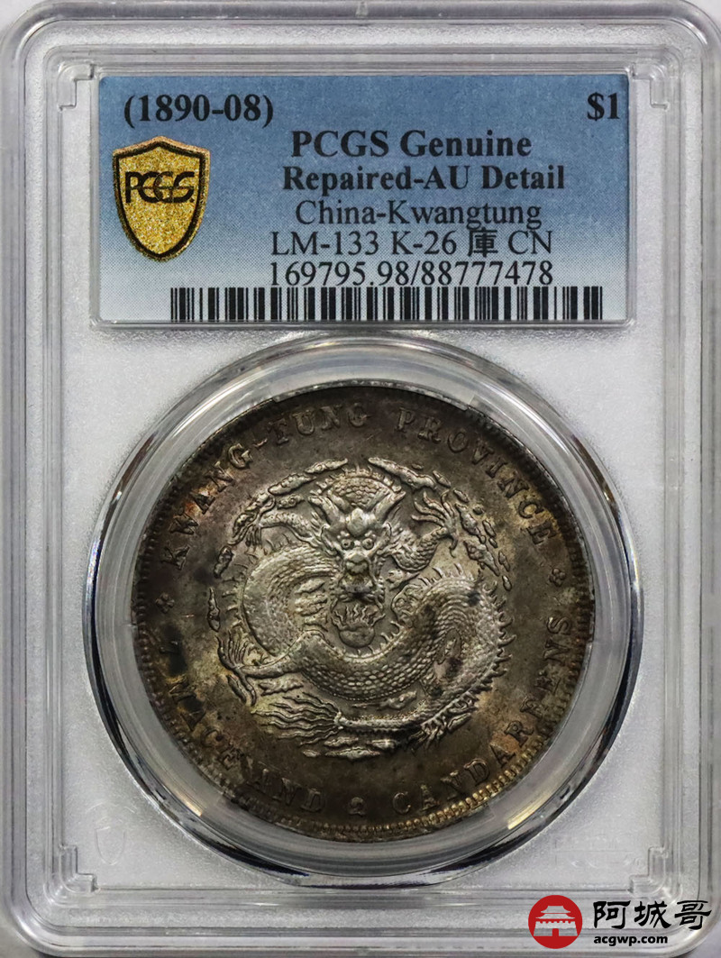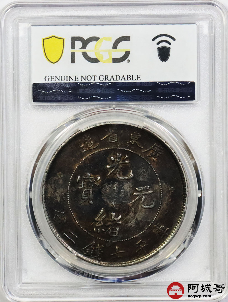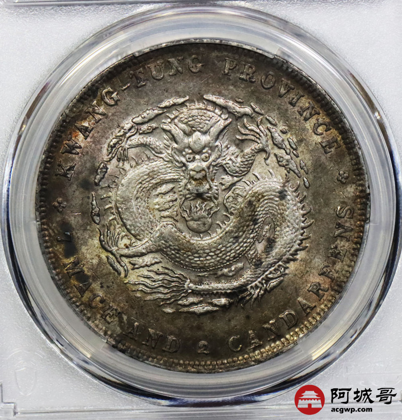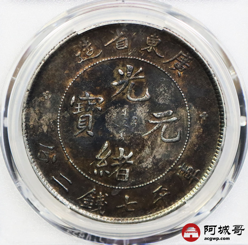 Lot:1787 1890-08年广东省造光绪元宝库平七钱二分银币一枚,浓郁酱彩包浆 PCGS AU98评级编号:88777478