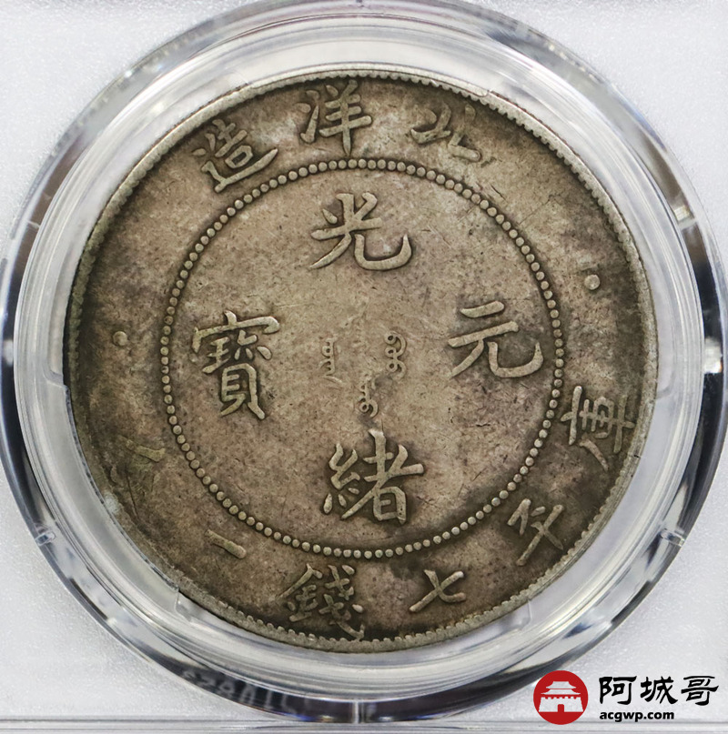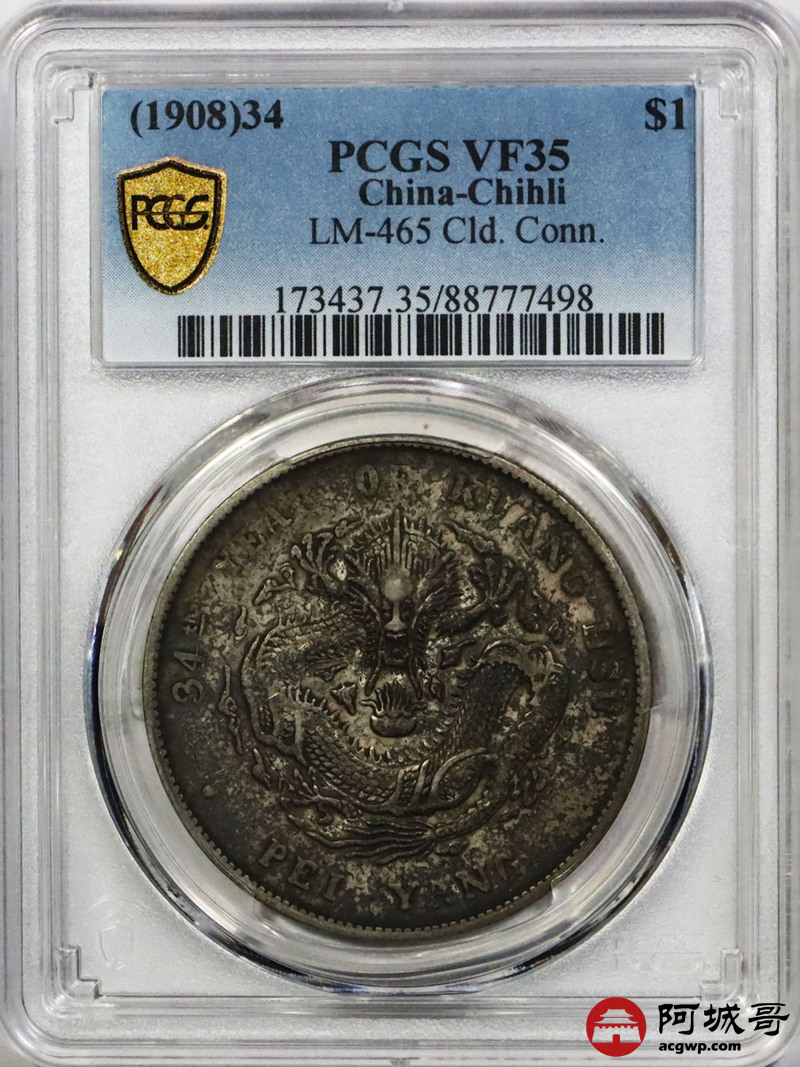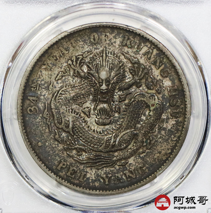Lot:1632 1908光绪三十四年北洋造光绪元宝库平七钱二分银币一枚,原味龙面酱彩 PCGS VF35评级编号:88777498