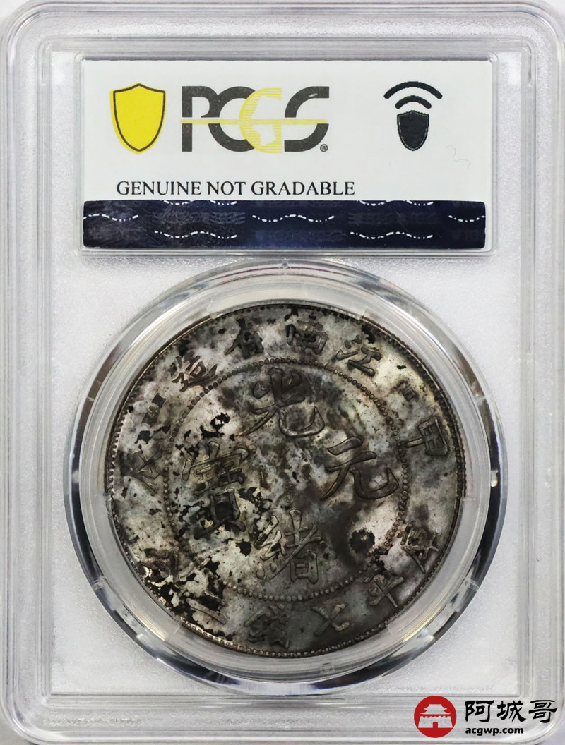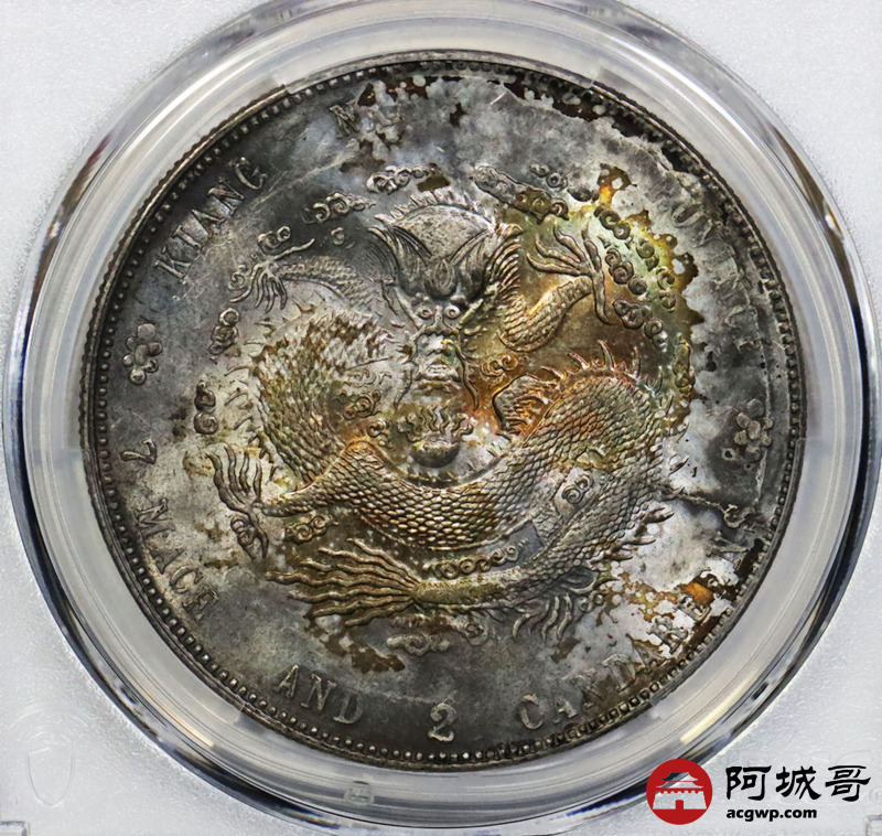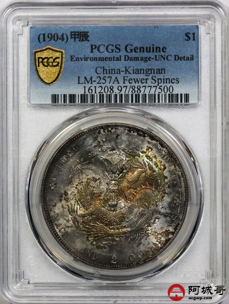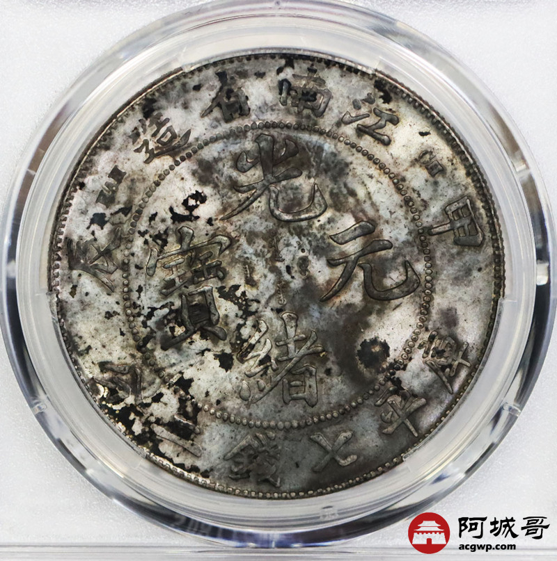 Lot:1345 1904甲辰年江南省造光绪元宝库平七钱二分银币一枚,底板氧化五彩 PCGS UNC97评级编号:88777500