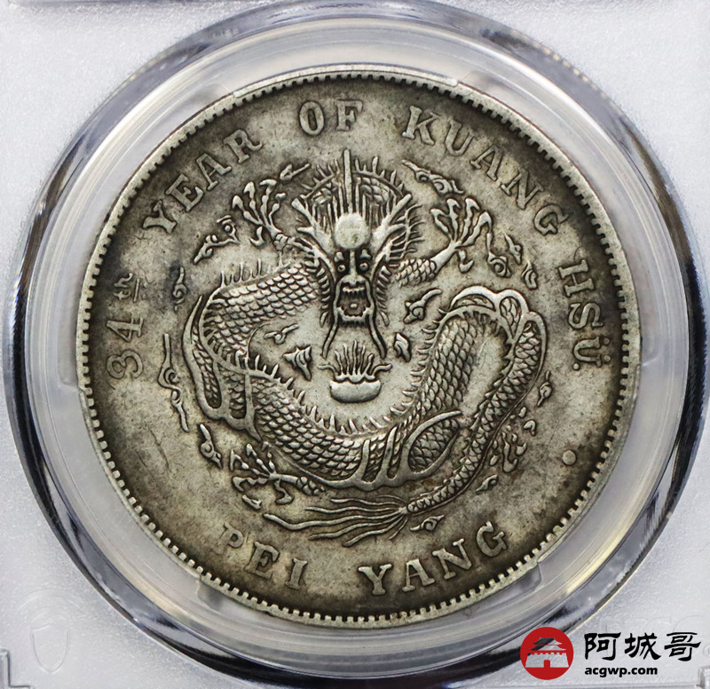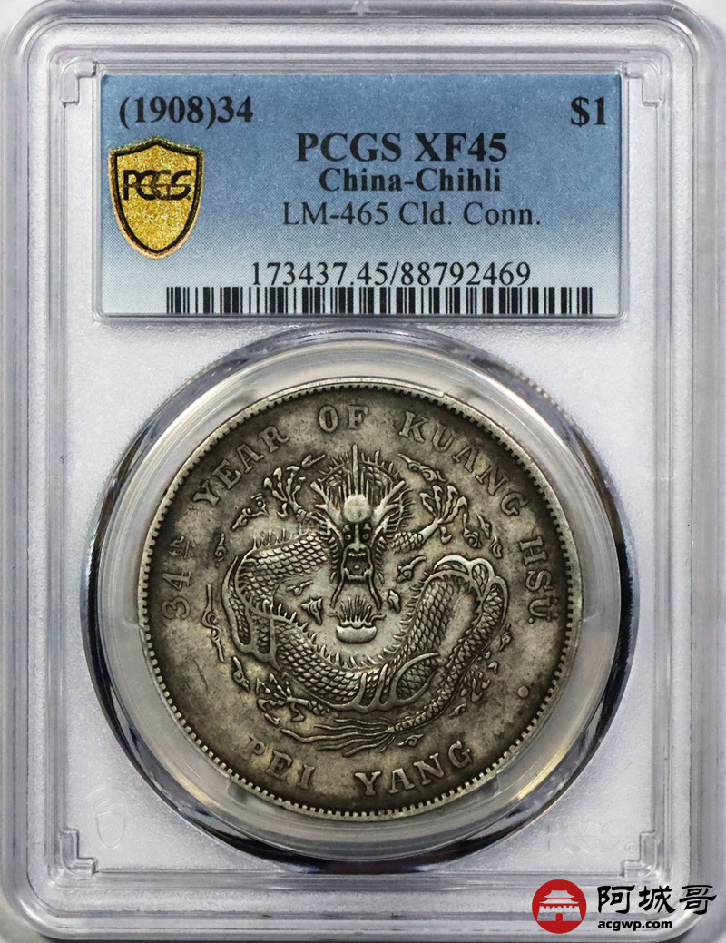 Lot:1670 1908光绪三十四年北洋造光绪元宝库平七钱二分银币一枚,原味 PCGS XF45评级编号:88792469