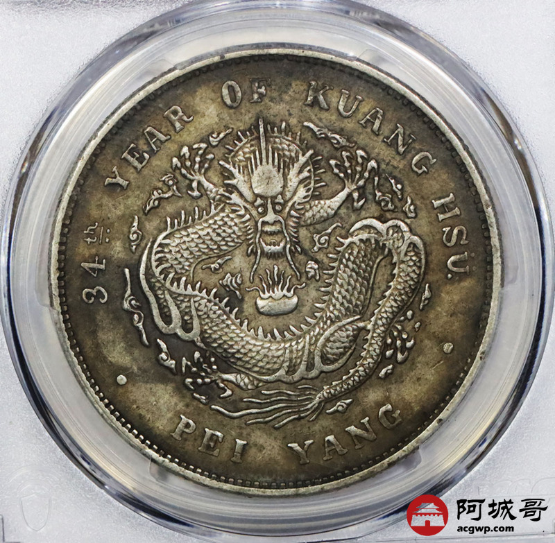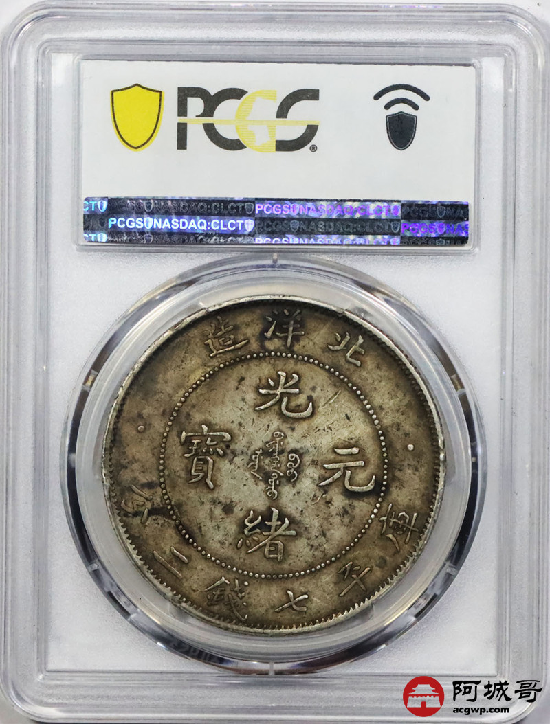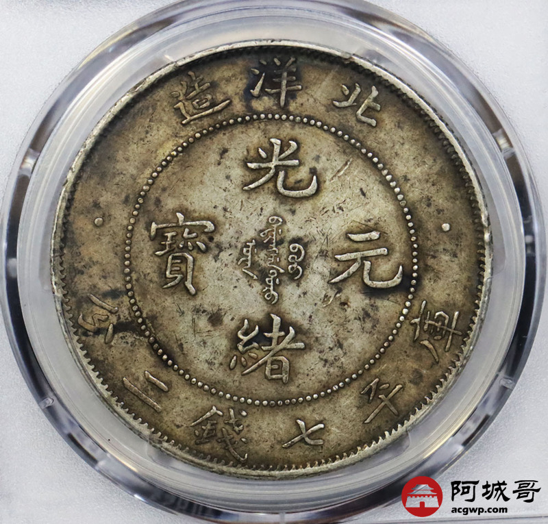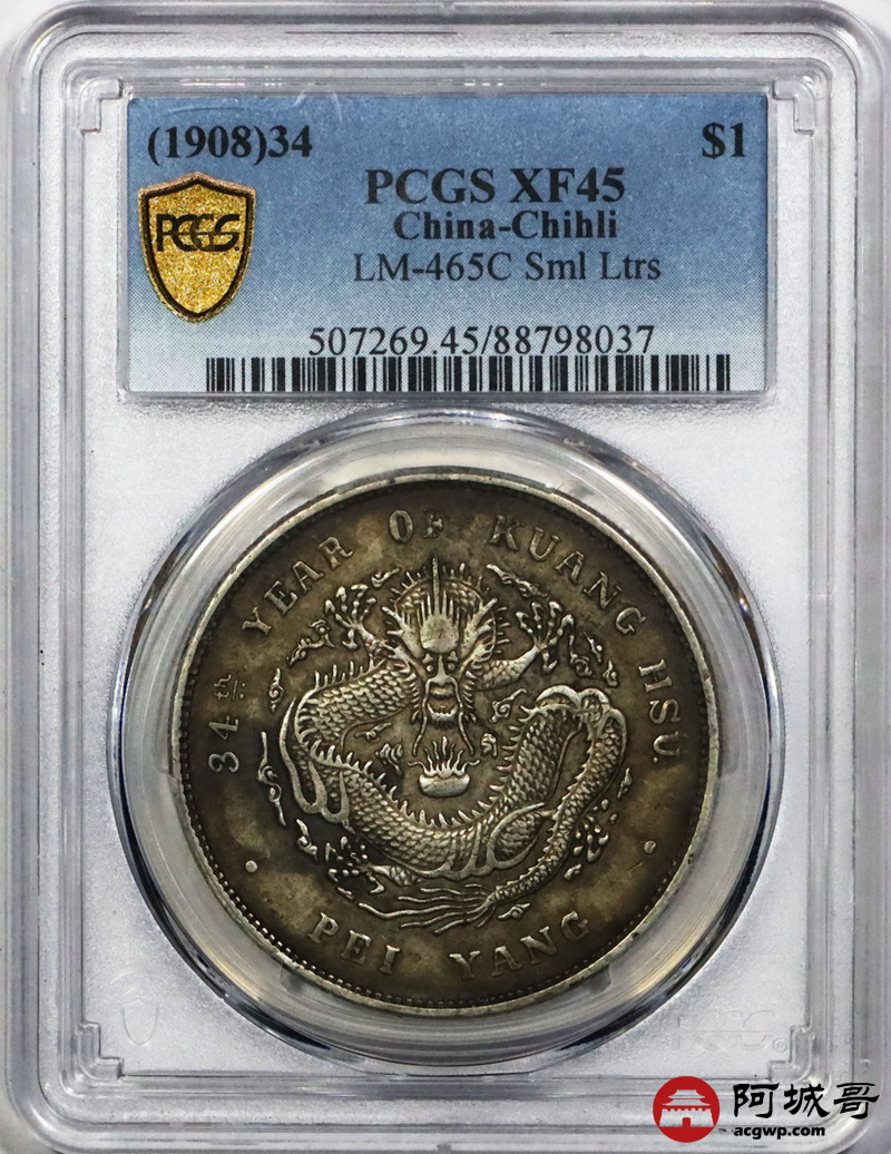 Lot:1672 1908光绪三十四年北洋造光绪元宝库平七钱二分银币一枚,小字版,酱彩包浆 PCGS XF45评级编号:88798037