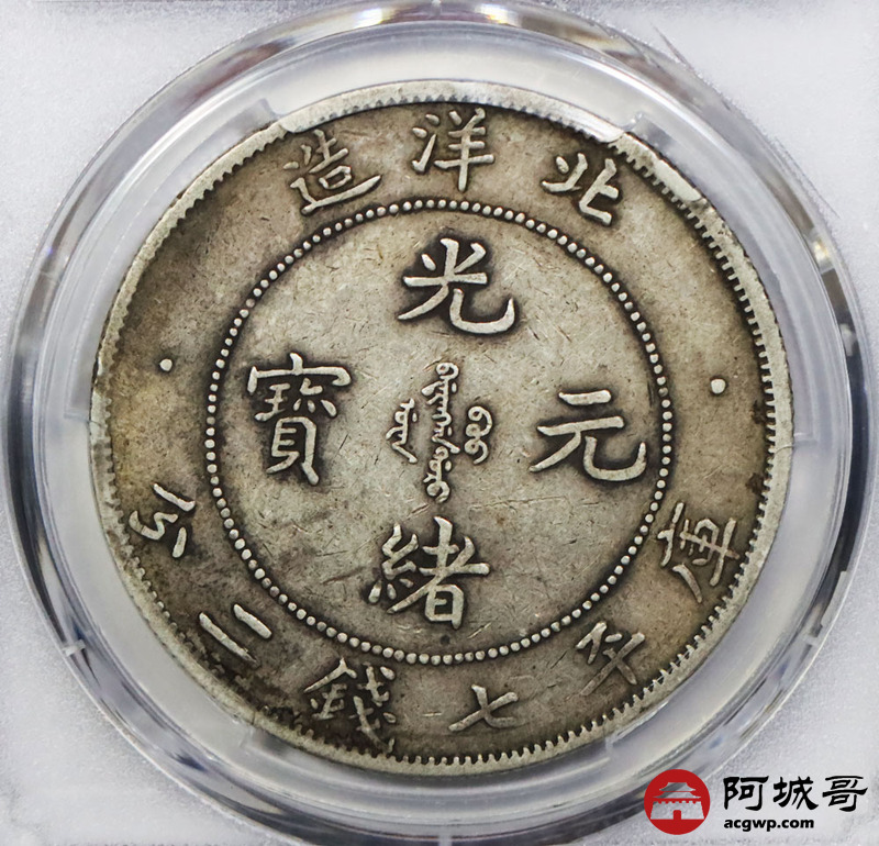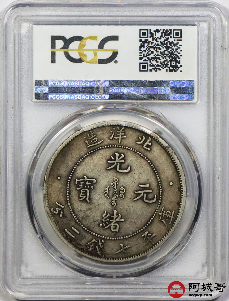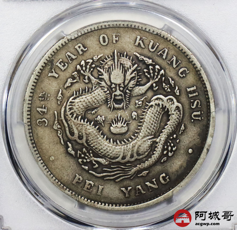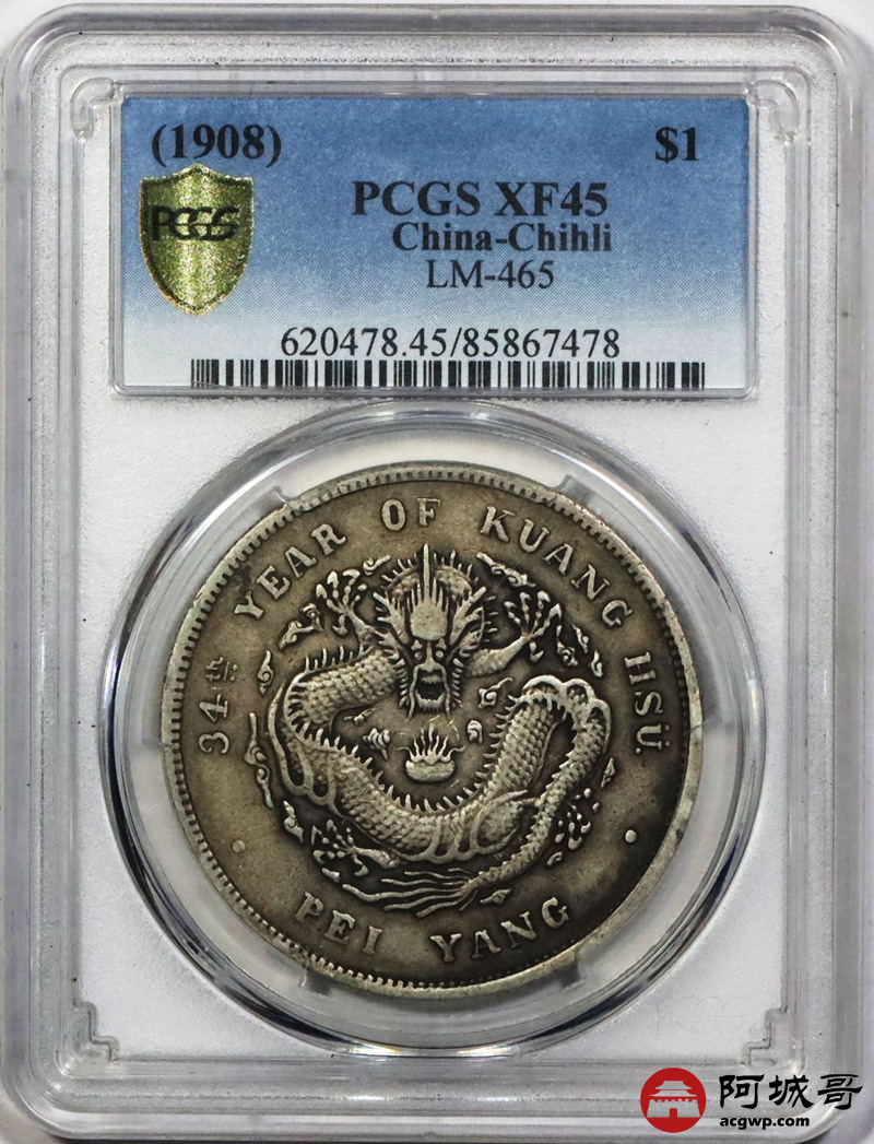 Lot:1678 1908光绪三十四年北洋造光绪元宝库平七钱二分银币一枚,小字版,原味传世包浆 PCGS XF45评级编号:85867478