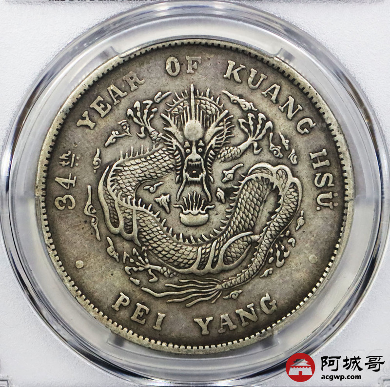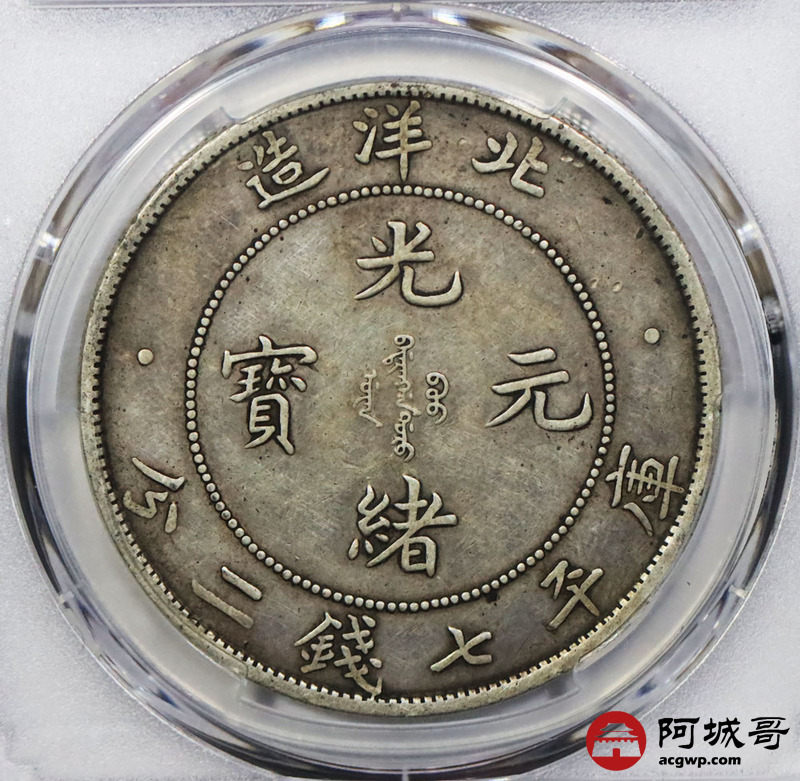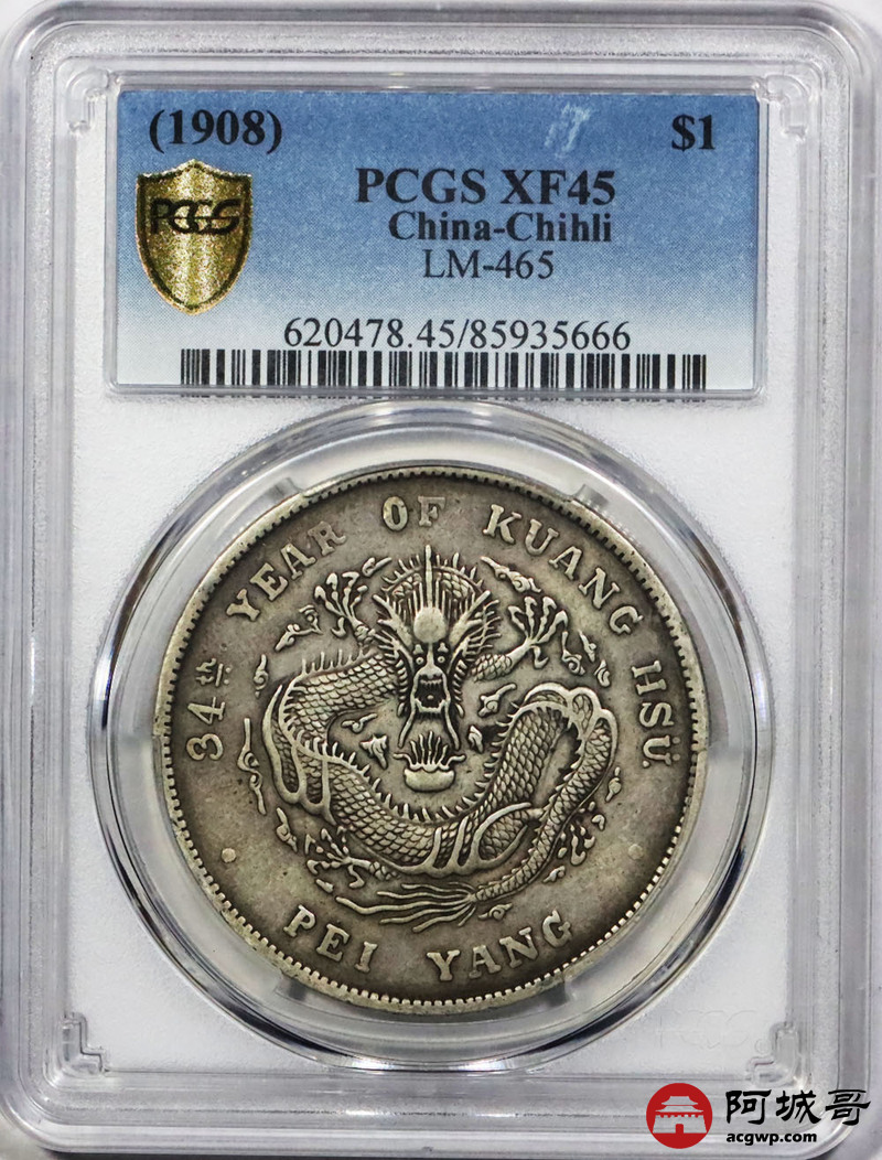 Lot:1675 1908光绪三十四年北洋造光绪元宝库平七钱二分银币一枚,原味 PCGS XF45评级编号:85935666