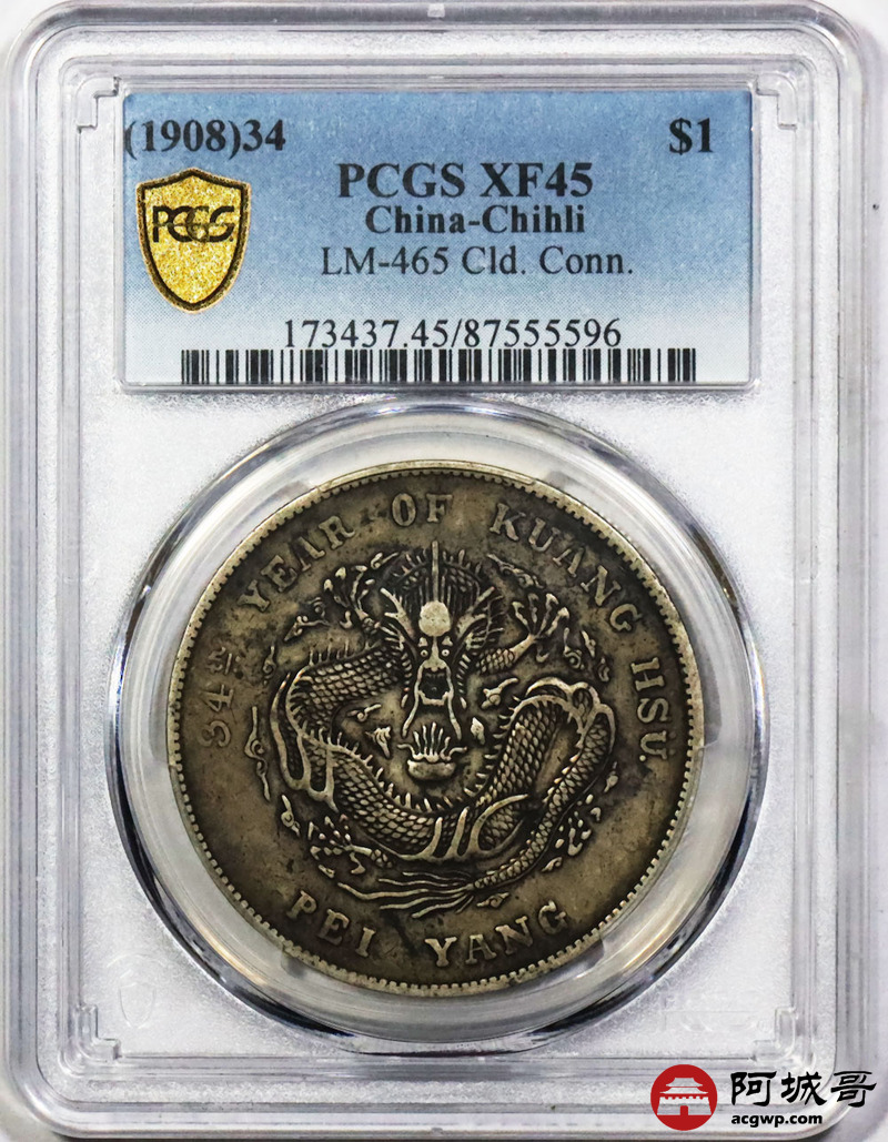 Lot:1673 1908光绪三十四年北洋造光绪元宝库平七钱二分银币一枚,原味 PCGS XF45评级编号:87555596