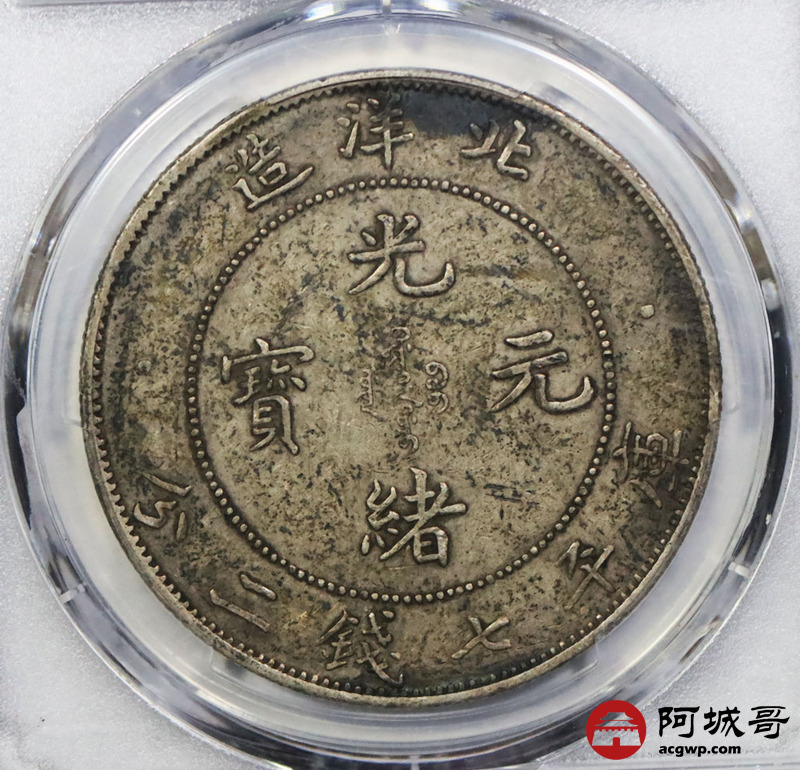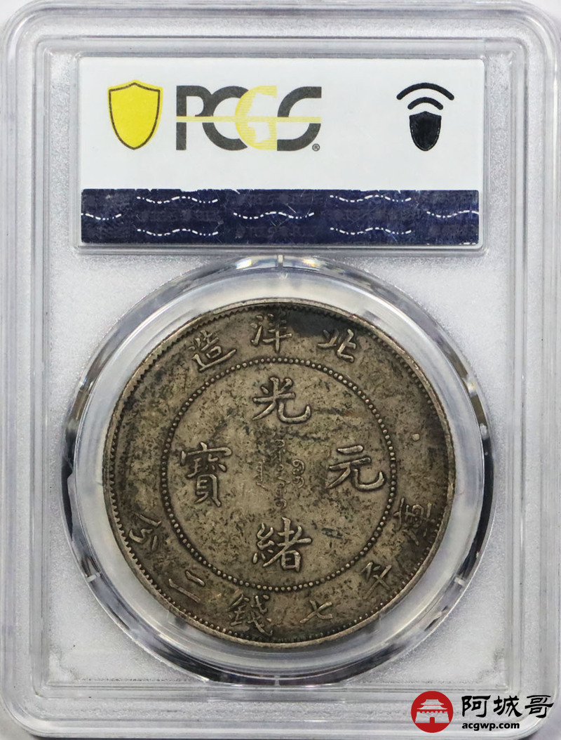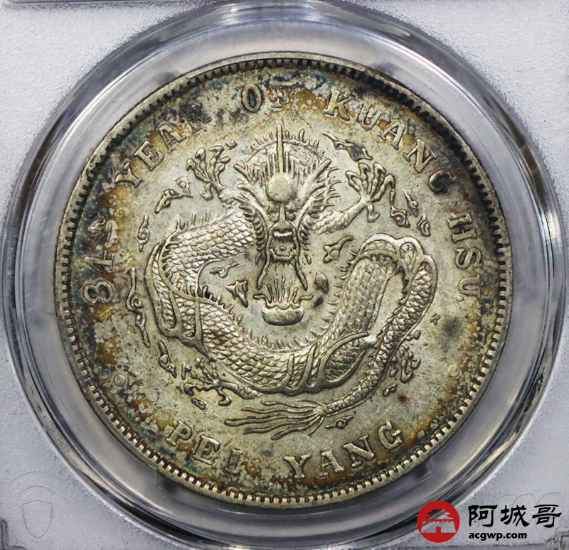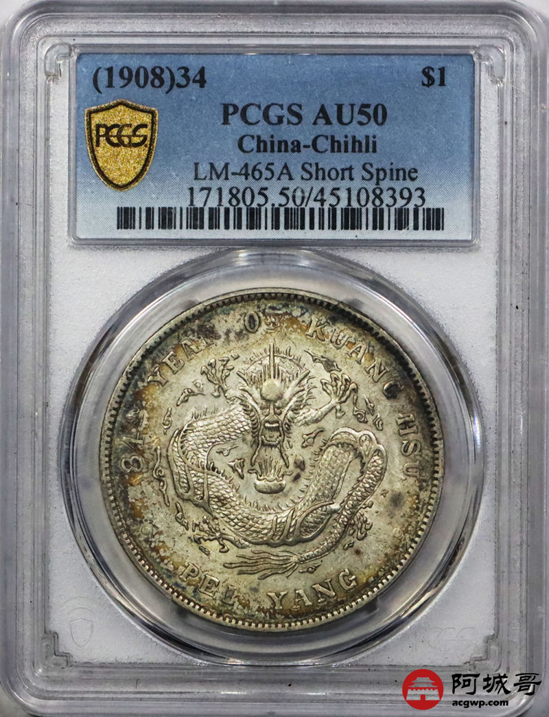 Lot:1669 1908光绪三十四年北洋造光绪元宝库平七钱二分银币一枚,短尾龙,底板五彩 PCGS AU50 评级编号:45108393