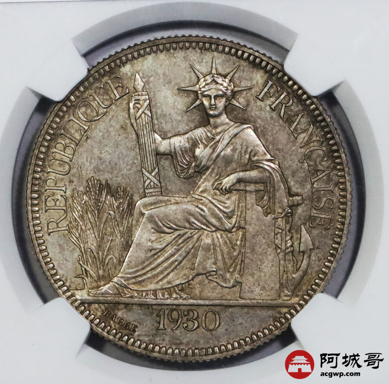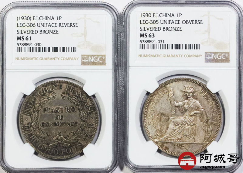 Lot:1318 1930年法属安南贸易银元坐洋银质样币两枚,原味 NGC MS61/63评级编号:5788891-030-5788891-031