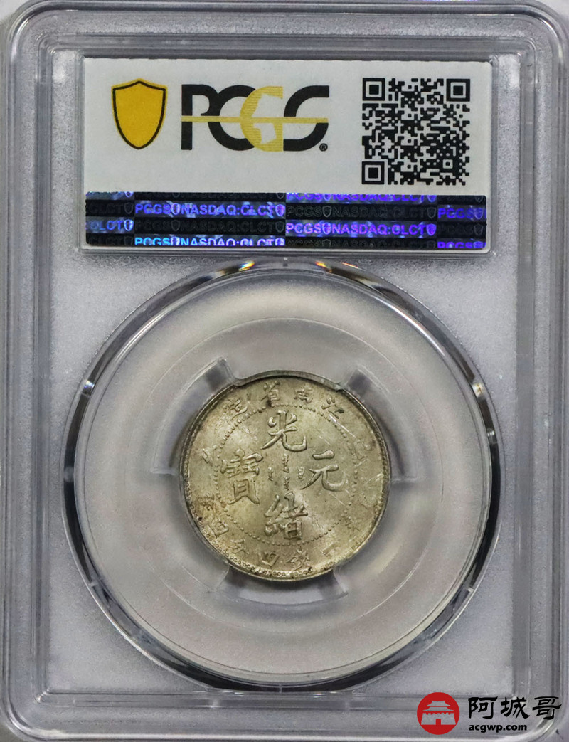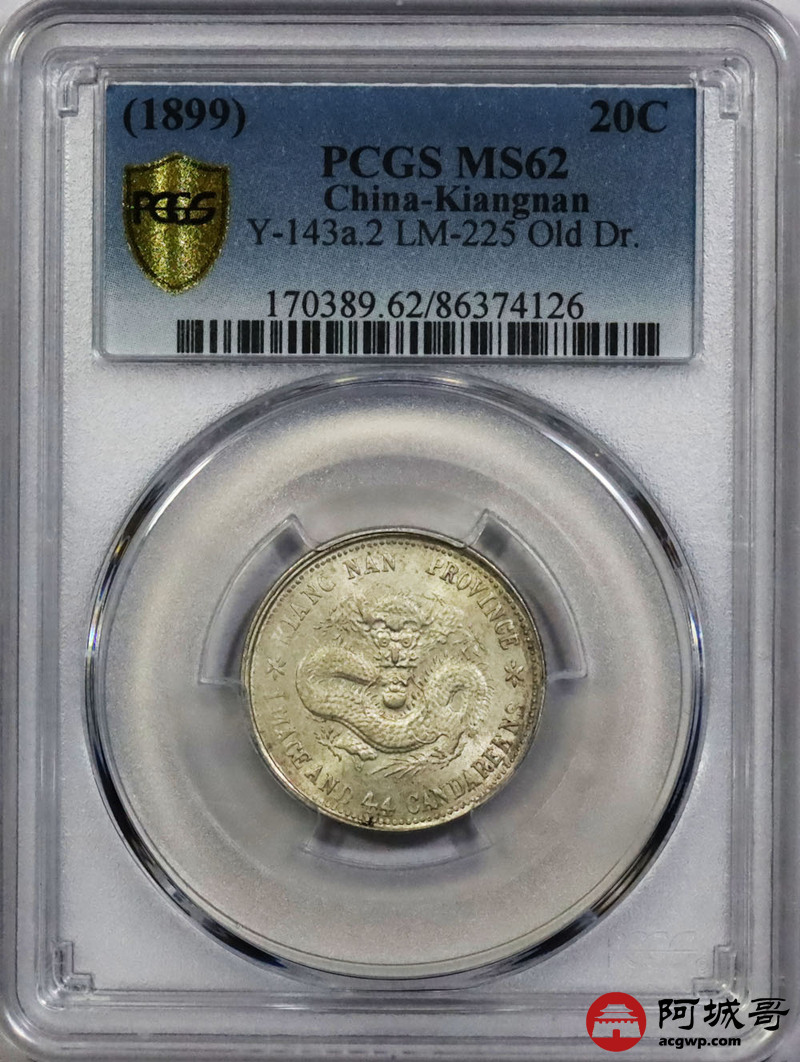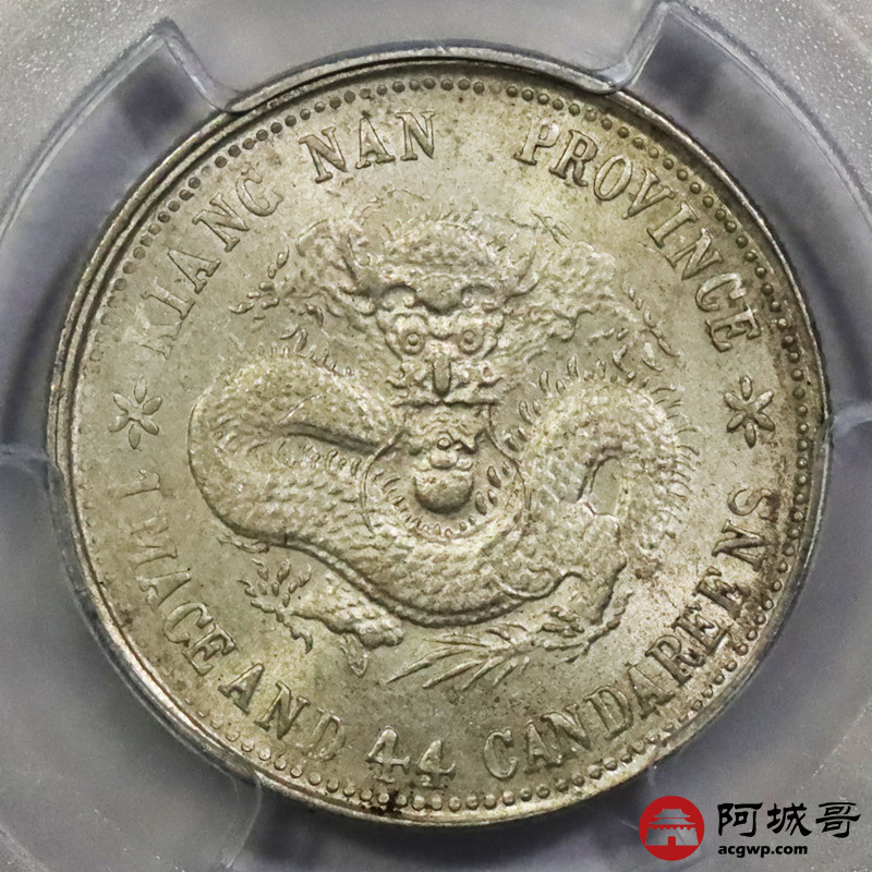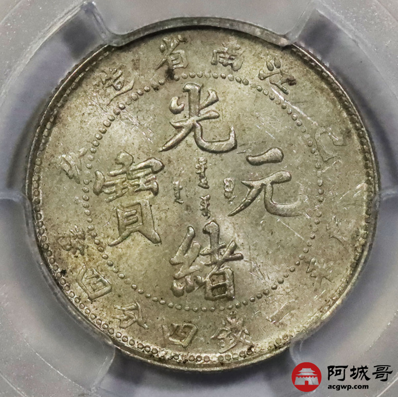 Lot:1355 1899己亥年江南省造光绪元宝库平一钱四分四厘银币一枚,黄油底板 PCGS MS62评级编号:86374126