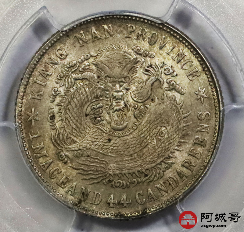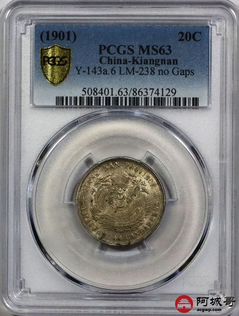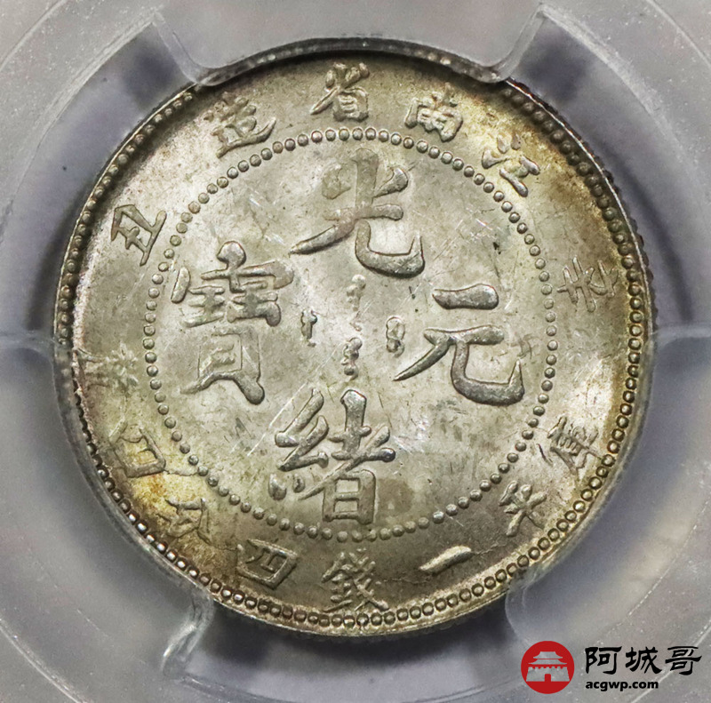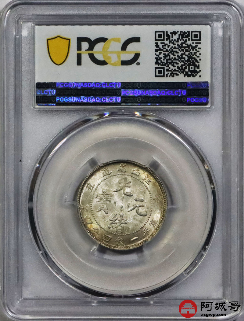 Lot:1353 1901辛丑年江南省造光绪元宝库平一钱四分四厘银币一枚,黄油底板 PCGS MS63评级编号:86374129