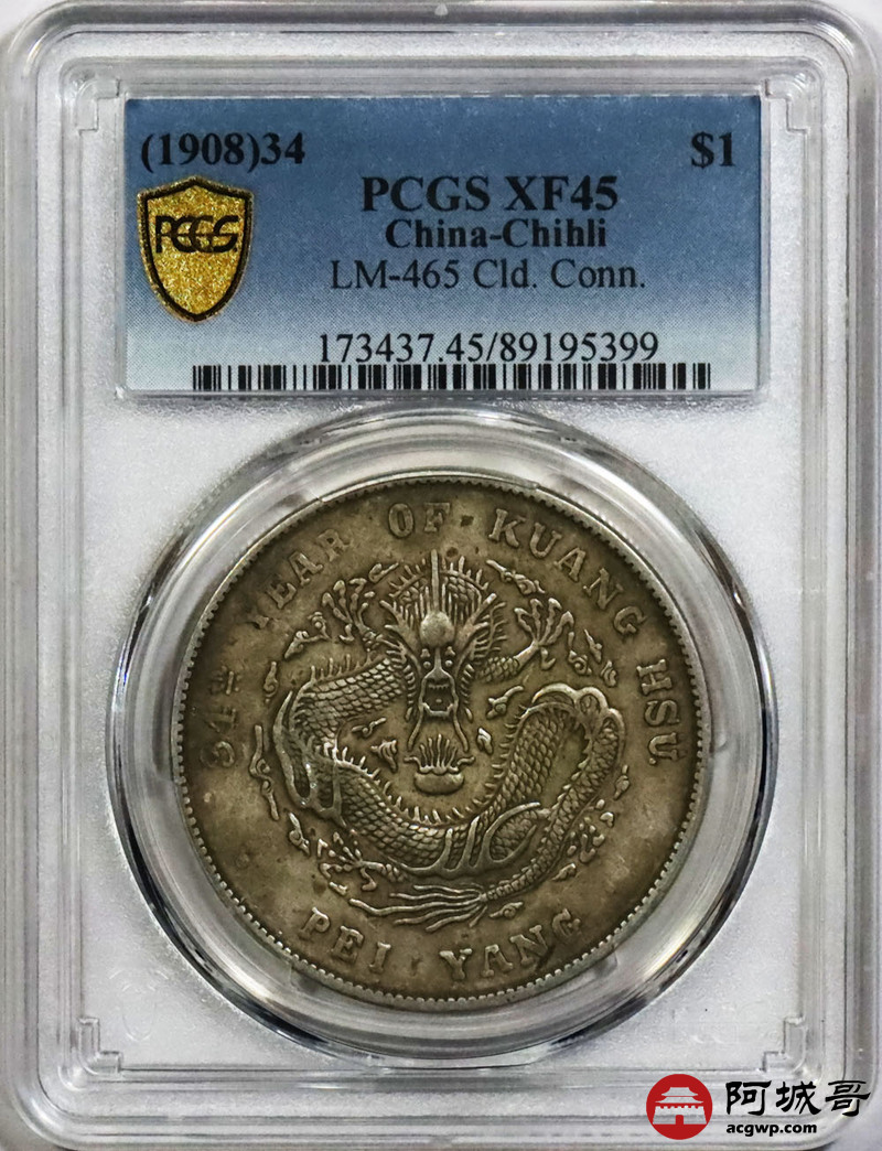 Lot:1584 1908光绪三十四年北洋造光绪元宝库平七钱二分银币一枚, 原汁原味 PCGS XF45 评级编号:89195399