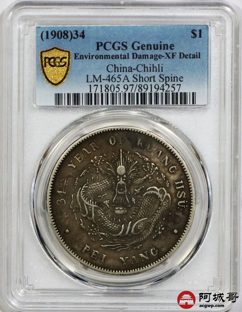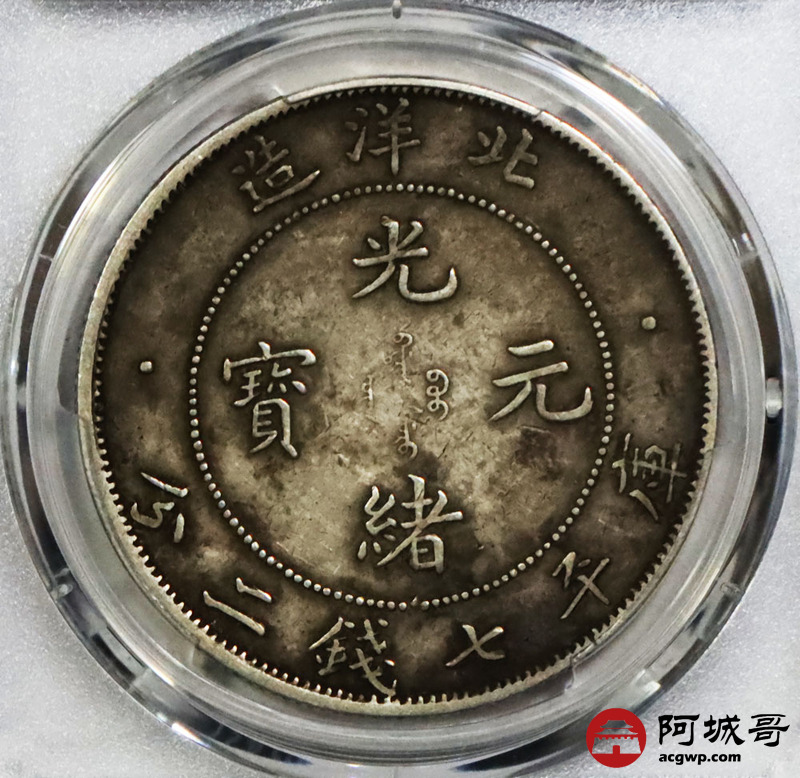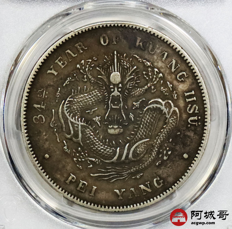 Lot:1633 1908光绪三十四年北洋造光绪元宝库平七钱二分银币一枚, 短尾版,原味 PCGS XF97评级编号:89194257