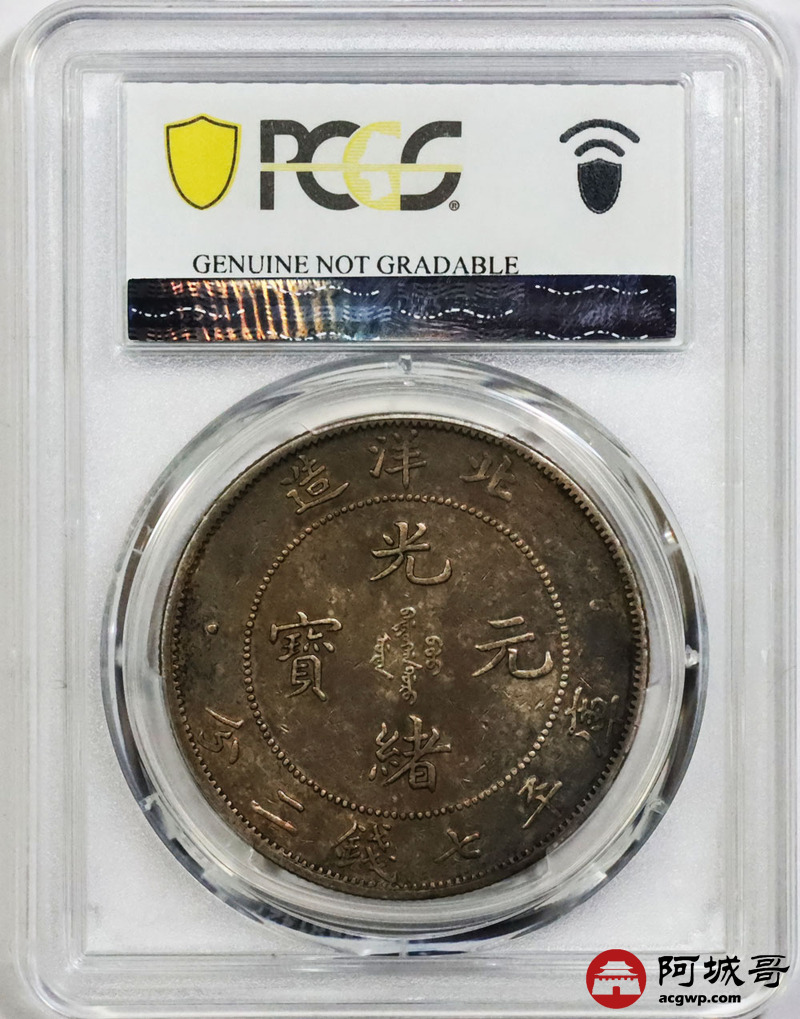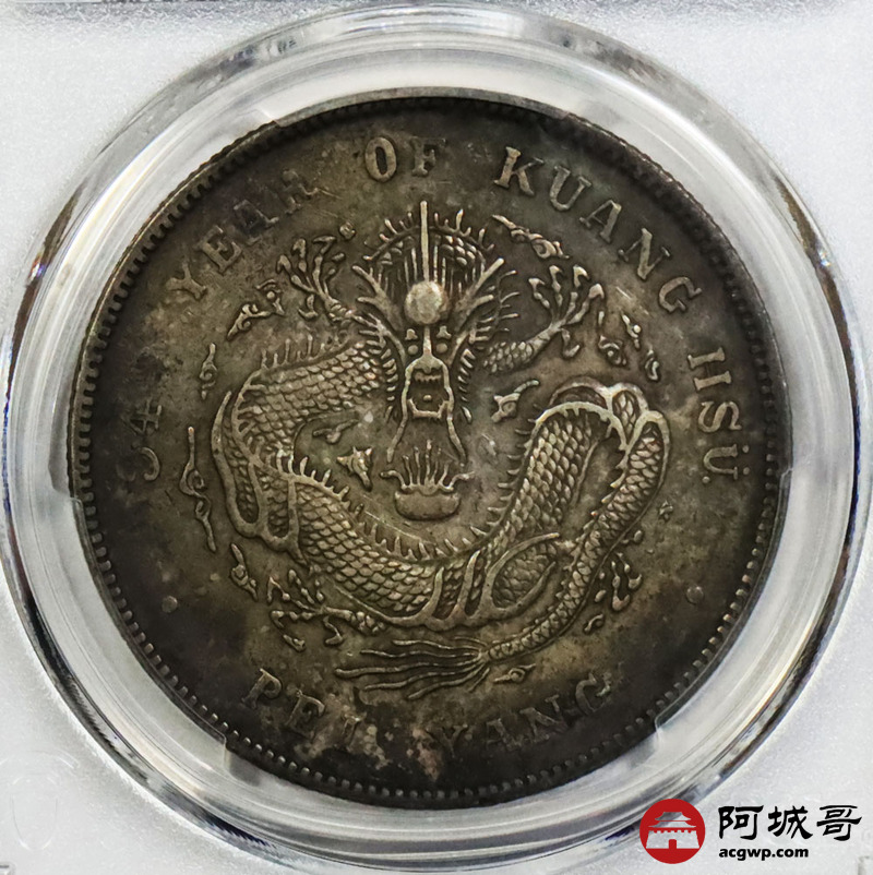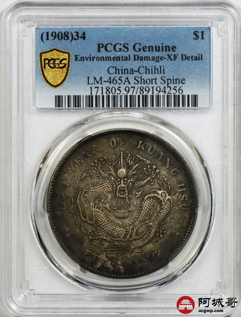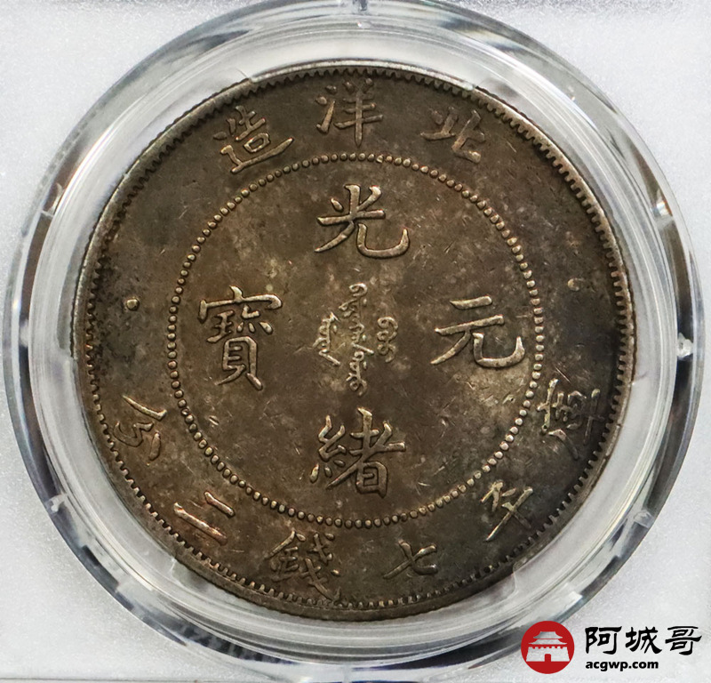 Lot:1714 1908光绪三十四年北洋造光绪元宝库平七钱二分银币一枚,短尾龙,底板酱彩 PCGS XF97评级编号:89194256