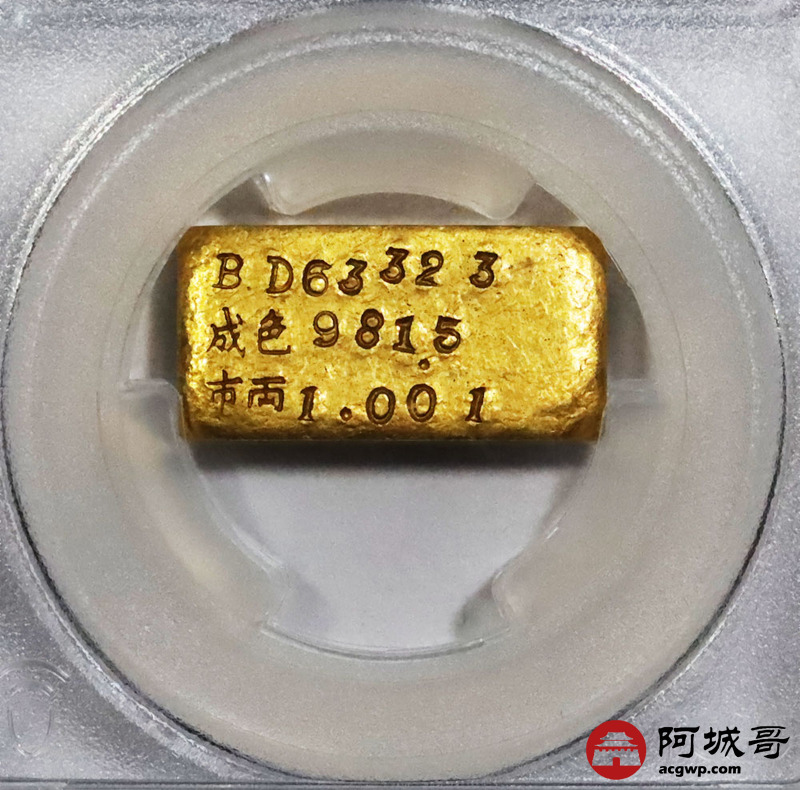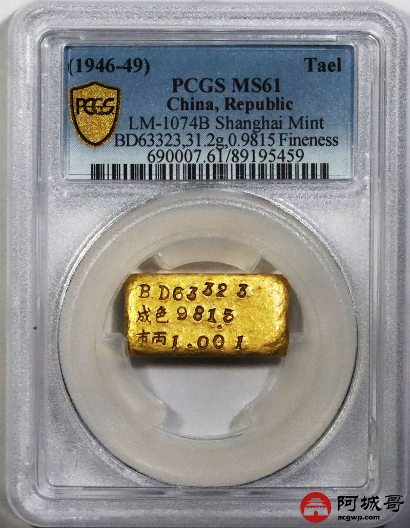 Lot:1501 1946-49年民国时期上海中央造币厂徽布图一两金厂条一枚31.2g PCGS MS61评级编号:89195459