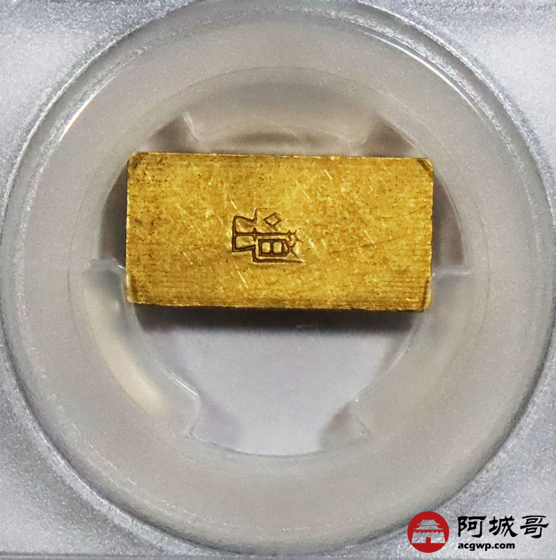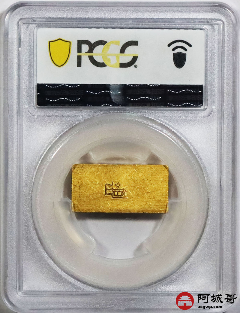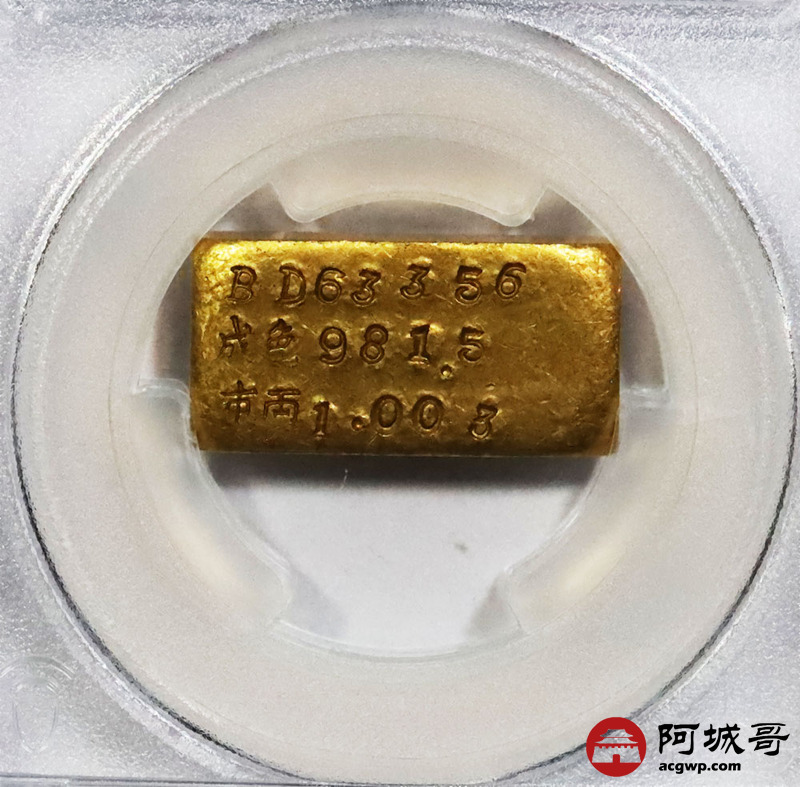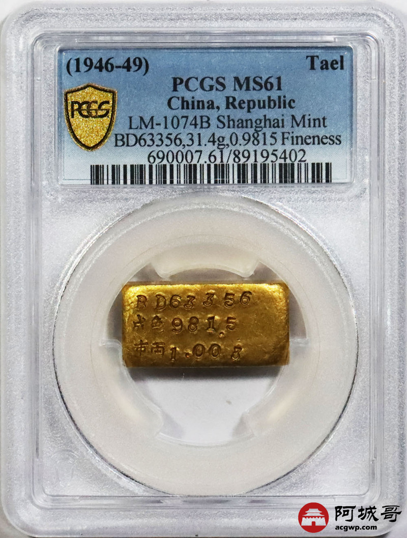 Lot:1503 1946-49年民国时期上海中央造币厂徽布图一两金厂条一枚,31.4g PCGS MS61评级编号:89195402