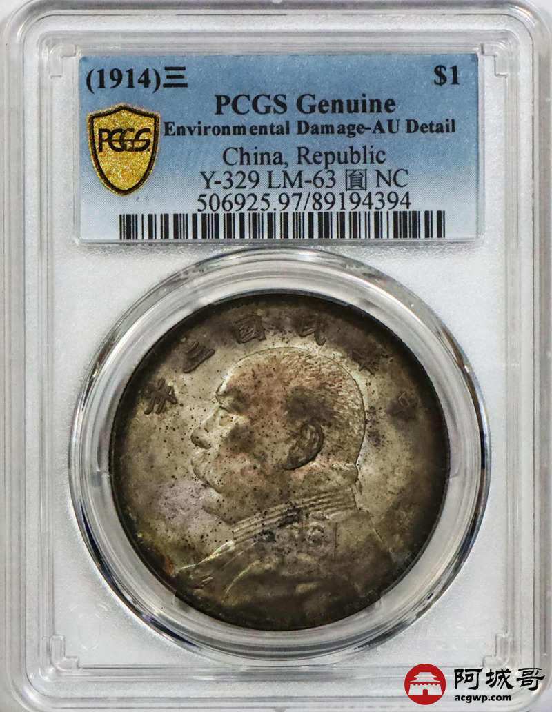 Lot:1830 1914民国三年袁世凯像壹圆银币一枚,原味 PCGS AU97评级编号:89194394