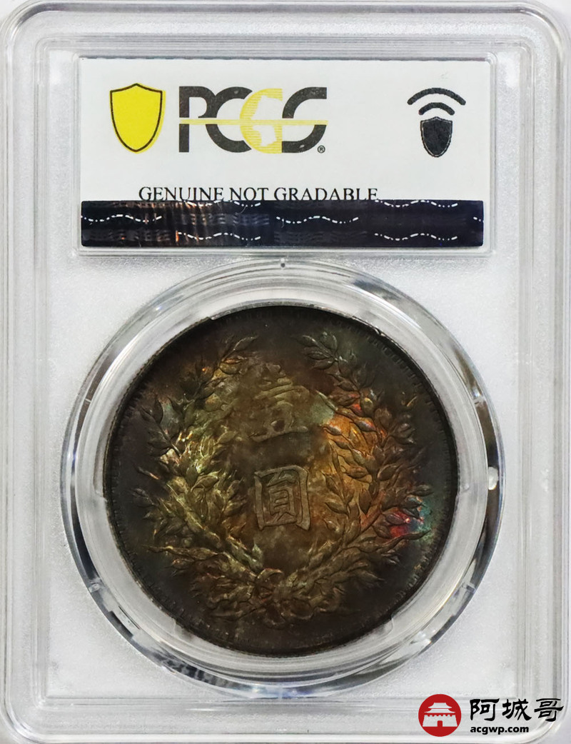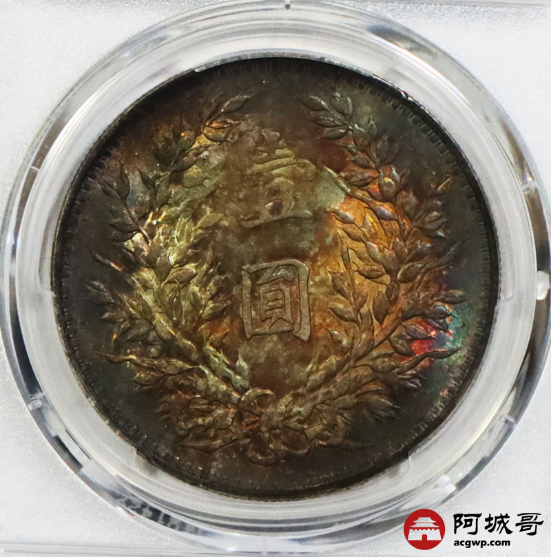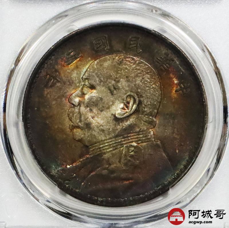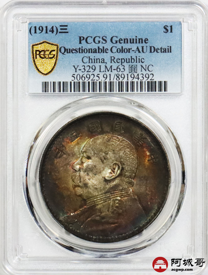 Lot:1829 1914民国三年袁世凯像壹圆银币一枚,炫丽五彩包浆 PCGS AU91评级编号:89194392